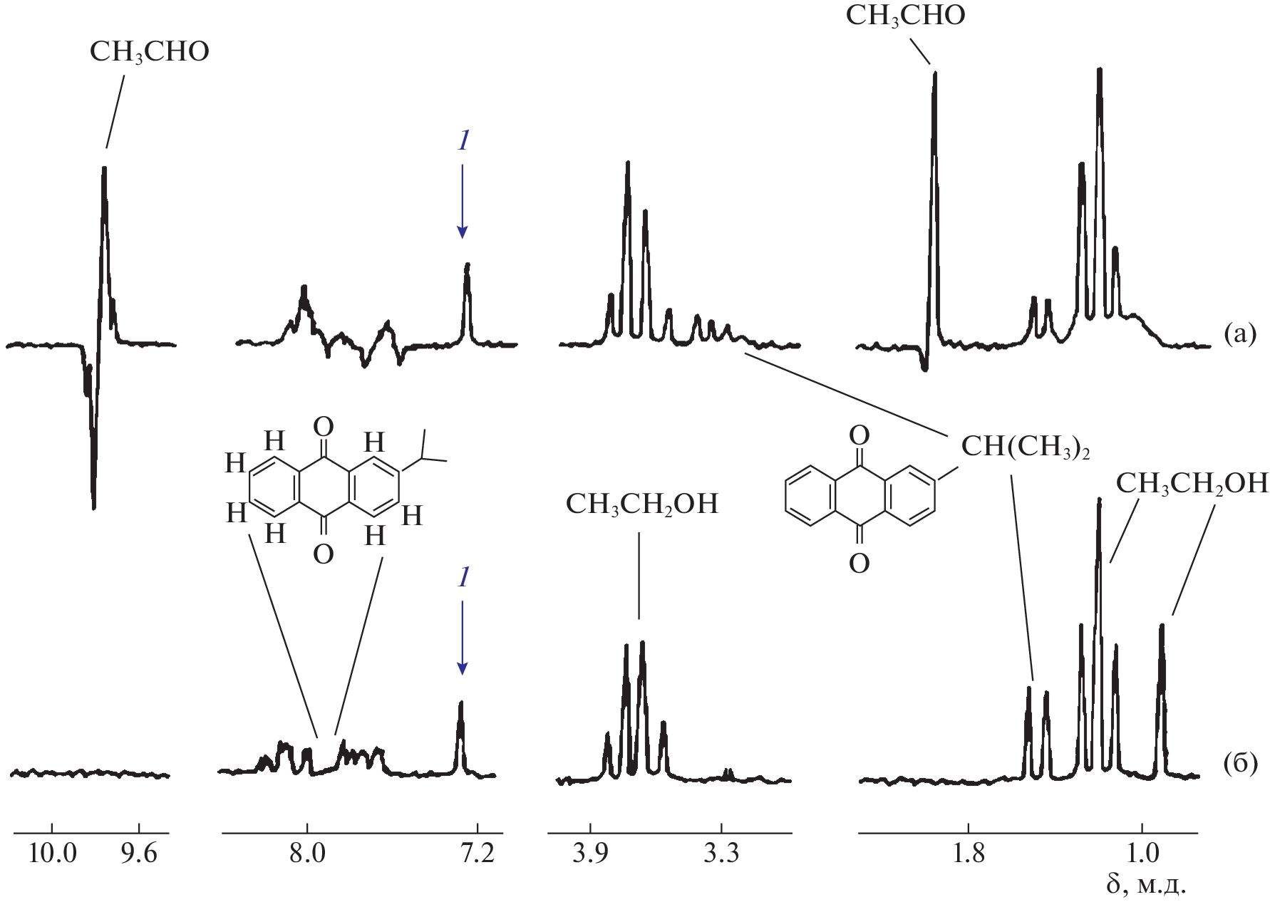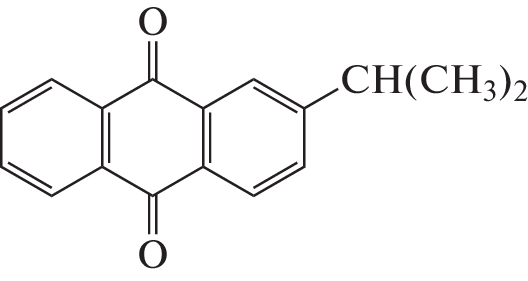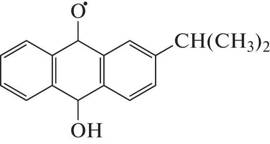 Установлены механизм и продукты фотореакции 2-изопропил-9,10-антрахинона (1) с этанолом. Анализ сигналов химической поляризации ядер (ХПЯ) показал, что при формировании ХПЯ имеет место только механизм синглет-триплетных переходов в радикальных парах без участия триплетного механизма. При исследовании фазы мультиплетного и интегрального эффектов определены элементарные акты фотореакции, а также установлена структура антрасемихинонного радикала, принимающего участие в реакции.