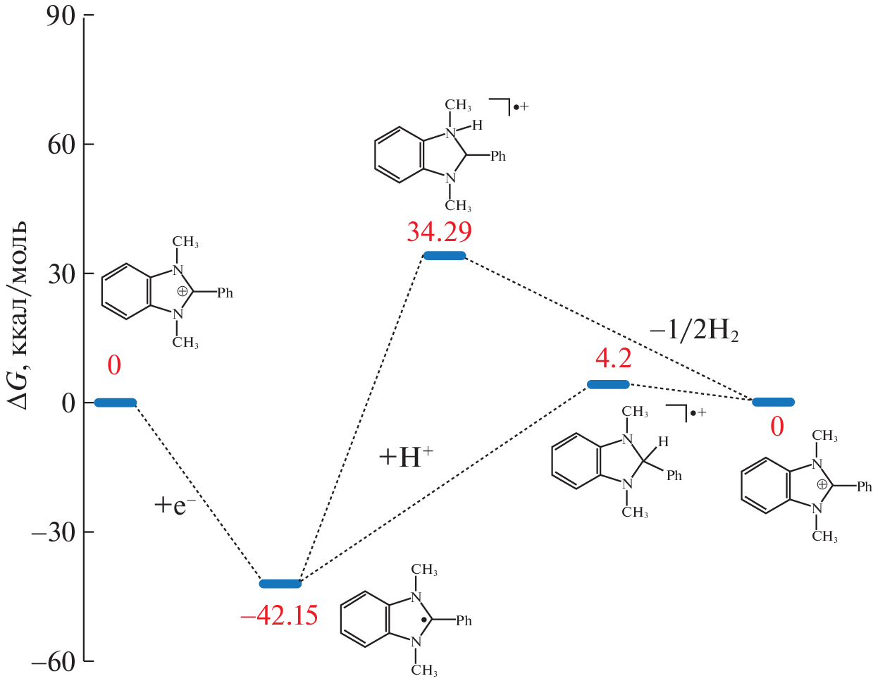 Изучены электрохимические свойства и электрокаталитическая активность представителя нового класса органических безметальных электрокатализаторов в реакции получения молекулярного водорода – 1,3-диметил-2-фенил-1Н-бензо[d]имидазолий-3 иодида (I) в присутствии различных по силе кислот (метансульфоновая кислота (CH3SO3H), хлорная кислота (HClO4) и трифторуксусная кислота (CF3COOH)). Показано, что эффективность электрокаталитического процесса сильно зависит от pKa используемых кислот. C использованием метода газовой хроматографии и препаративного электролиза проведенных при потенциалах полуволн в случае всех кислот показало, что во всех случаях регистрируется образование молекулярного водорода с высокими фарадеевскими выходами. В присутствии всех кислот, поведение каталитической волны на ЦВА (циклическая вольтамперограмма), при различных соотношениях концентраций кислоты и катализатора типично для протекания процесса по гомогенному механизму. Методом функционала плотности (DFT) изучен механизм протекающего процесса, выявлены его основные интермедиаты, показано, что стадия протонирования электрохимически генерированных радикалов по С-2 атому углерода соединения I, с образованием С-протонированого катион-радикала – является ключевой в протекании электрокаталитического процесса выделения водорода HER-процесса (Hydrogen Evolution Reaction).