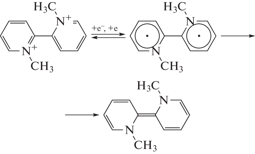 The electrochemical properties of N-substituted salts of 2,2'-bipyridine: N-methyl-2,2'-bipyridinium iodide and N,N '-dimethyl-2,2'-bipyridinium iodide were studied by cyclic voltammetry (CV). The electrochemical properties are greatly affected by the methyl substituents at the nitrogen atom in the ortho-bipyridine molecule. The conproportionation constants were calculated for N,N '-dimethyl-2,2'-bipyridinium iodide and made it possible to judge about the degree of electron localization in the systems.
