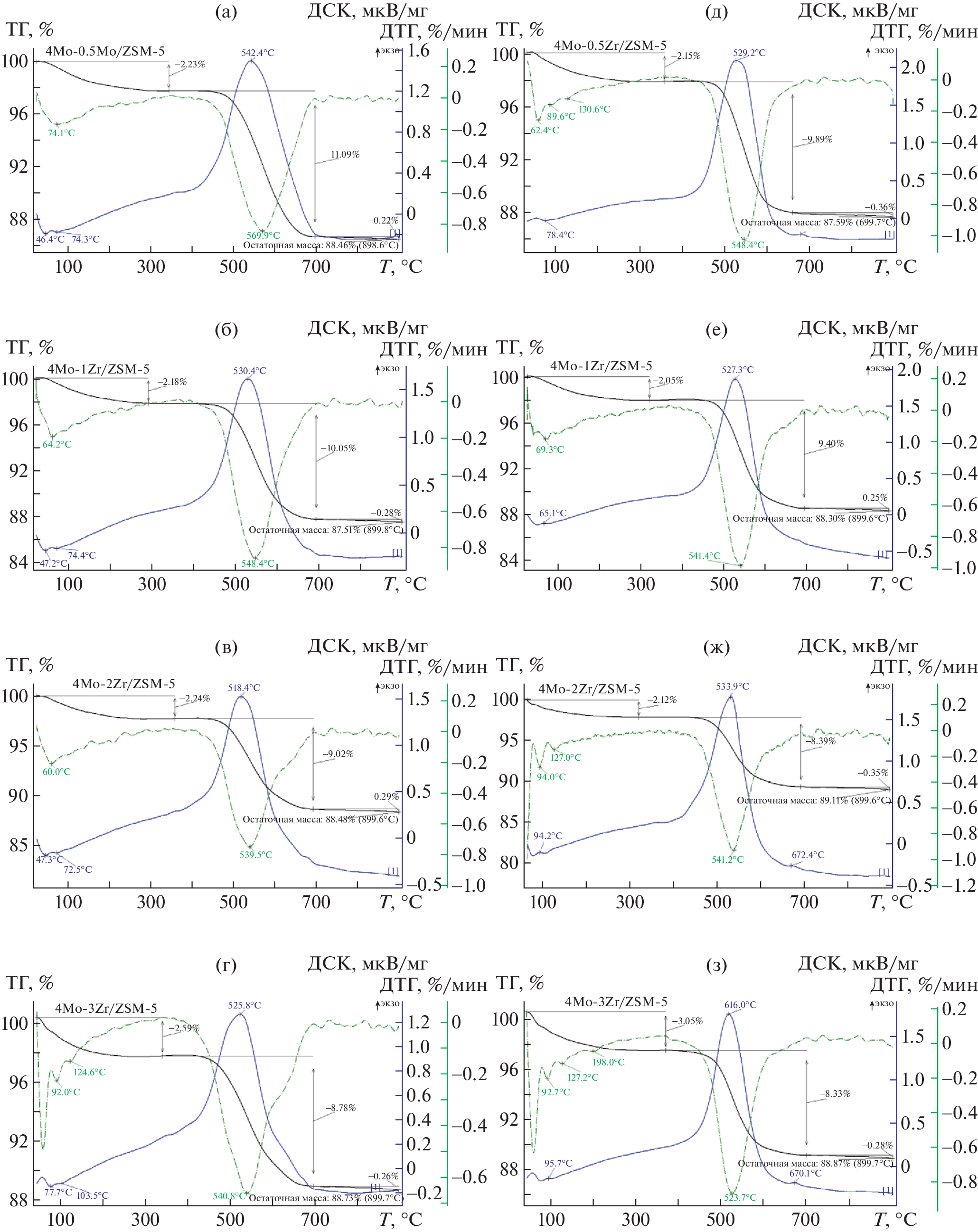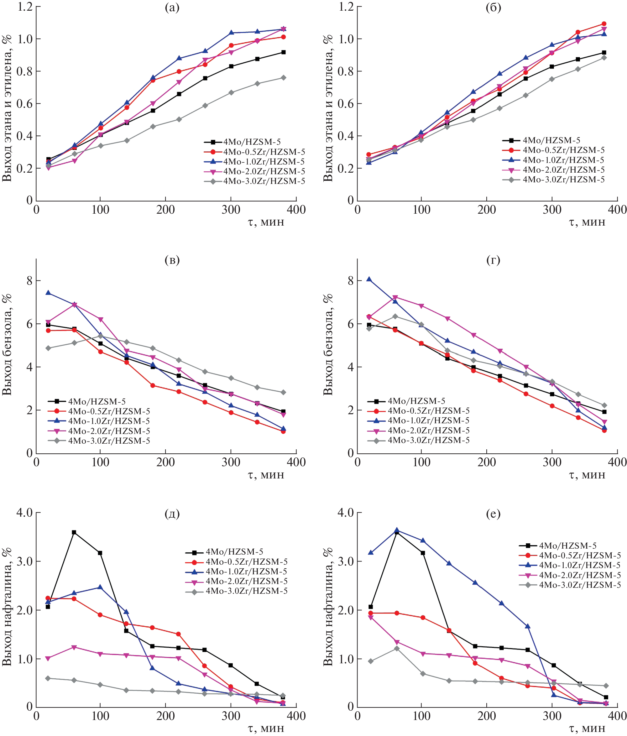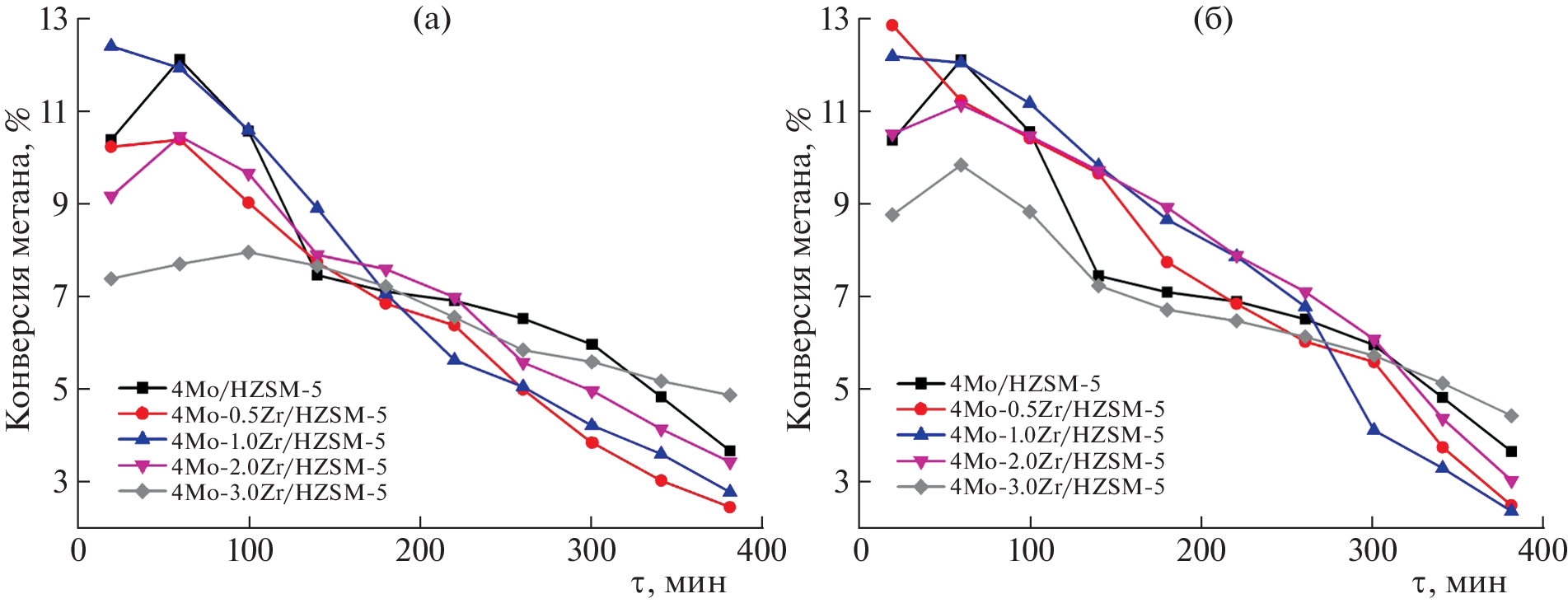 The effect of the method for the introduction of zirconium in the 4Mo/ZSM-5 catalyst and of its amount on the physicochemical and catalytic properties of the catalyst during the nonoxidative conversion of methane into aromatic hydrocarbons (benzene and naphthalene) has been studied. The catalyst was modified with zirconium by impregnation and solid phase mixing. The resulting zeolite catalysts were studied by IR spectroscopy, X-ray diffraction analysis, low-temperature nitrogen adsorption, temperature-programmed ammonia desorption, scanning and transmission electron microscopy, and simultaneous thermal analysis. With an increase in the zirconium concentration introduced in the 4Mo/ZSM-5 catalyst, the strength and concentration of its strong acid sites that are responsible for methane aromatization decrease regardless of the method of modification. The particle size and morphology of the catalyst, the distribution of Mo and Zr in them, and the presence of coke deposits on their surface were determined by scanning and transmission electron microscopy. The catalytic tests and subsequent thermal analysis of the samples showed that the addition of zirconium to the 4Mo/ZSM-5 catalyst leads not only to an increase in its catalytic activity, but also to operational stability due to the lower rate of coke formation. It was established that 4Mo/ZSM-5 modified with 1 wt % Zr by solid-phase synthesis is the most effective catalyst in methane dehydroaromatization (DHA).