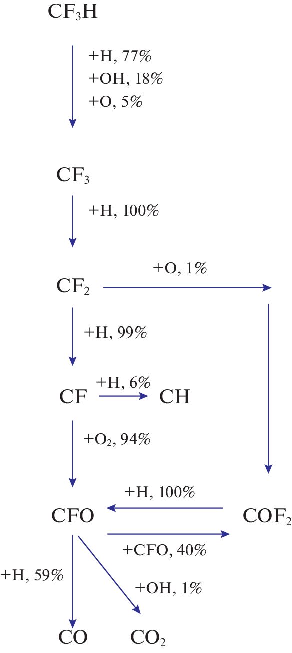 The mechanism of CF3H transformation in the flame of methane–oxygen mixtures of various compositions was calculated from the available experimental data on the concentrations of intermediates, taking into account only those elementary reactions whose kinetic parameters are known. In the flame of a CH4/O2 mixture, CF3H is destroyed in reactions with H, O, and OH without being regenerated, which disproves the classical (and still existing) ideas about the molecular mechanism of the transformation of initial reagents in the flame. In a rich mixture, the transformation mainly proceeds due to the reactions of CF3H, CF3, СF2, and COF2 with atomic hydrogen, competing with the stage of branching of the reaction chains that inhibit the combustion of methane in oxygen. In a stoichiometric and especially in a lean mixture, the role of oxidative processes involving O and OH increases, and the inhibition effect weakens. The resulting scheme qualitatively describes the entire known experimental picture observed during the combustion of CH4/O2/CF3H mixtures.