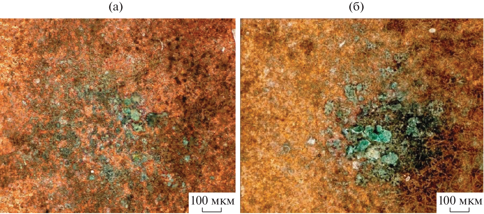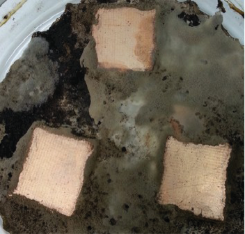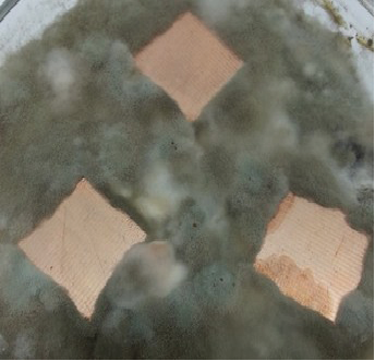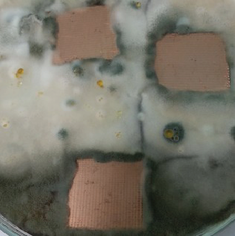 A study is performed of the micromycete biocorrosion of electrical copper M1E and fiberglass FR4 with copper coating, which are used in the production of printed circuit boards. The structure of the surfaces of corroded samples is studied via optical and electron microscopy. Energy dispersive X-ray spectroscopy is used to perform a qualitative and semi-quantitative analysis of chemical elements present in the composition of corrosion products after exposing samples to a bed of micromycetes. An X-ray phase analysis of the products of copper biocorrosion is performed. It is established that microorganisms adhere to the metal surface at the initial stage of micromycetic corrosion, and colonies of them develop. It is suggested that reactive oxygen species (superoxide anion-radical and hydrogen peroxide) participate in the biocorrosion of copper and the functioning of the zerovalent copper–hydrogen peroxide system, triggering a cascade of reactions that result in the destructive oxidation of copper. The role of biofilms of the microscopic fungal colony as the main factor in the mycological corrosion of copper is explained.