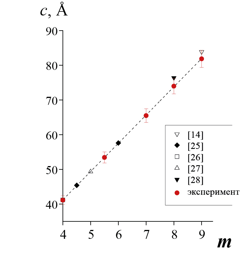 Фазовый состав определялся на дифрактометре Rigaku SmartLab 3 (CuKα-излучение). Уточнение рентгеновской дифрактограммы методом фундаментальных параметров свидетельствует о хорошем соответствии профиля линии данным эксперимента (рис. 1). Приведенная на рис. 2 зависимость параметра с ромбической элементарной ячейки от величины m показывает, что при комнатной температуре структурные параметры полученных материалов согласуются с данными, известными из литературы.