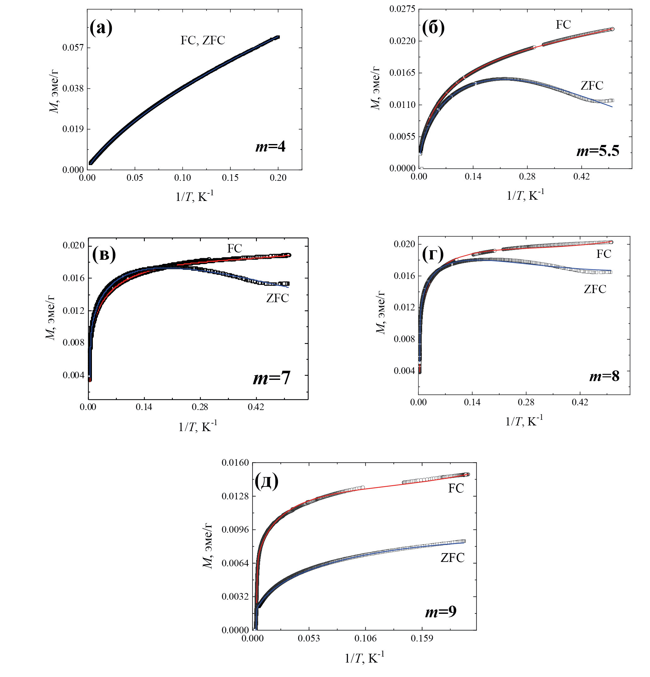 Из рис. 3а видно, что только для фазы Bi5FeTi3O15 (m = 4) кривые FC и ZFC совпадают. При этом зависимость воспроизводит сигмоидную только при малых значениях аргумента. Для остальных материалов кривые FC близки к сигмоидным, а ход зависимости ZFC от обратной температуры совпадает с сигмоидой только при малых значения аргумента, после чего наступает участок спада с последующим выходом на насыщение (рис. 3б–г). Исключение представляет также фаза с m = 9 (рис. 3г), для которой оба типа зависимостей близки к ходу логистической функции.