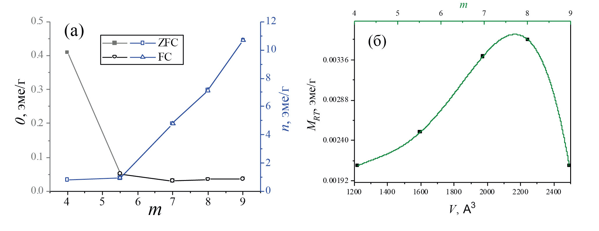 На рис. 4б показана зависимость ZFC намагниченности (MRT), измеренной при комнатной температуре, от параметров структуры соединений Bim+1Fem-3Ti3O3m+3 (объема элементарной ячейки, V). Из рисунка видно, что функция MRT(V) возрастает при увеличении V и достигает максимума при значениях m = 7 – 8. С дальнейшим ростом V и m график резко убывает. Как отмечалось выше, в этой области составов изменяется характер распределения ионов Fe3+ в структуре фаз Ауривиллиуса, который при m = 9 становится статистическим. Видно, что для девятислойной фазы Ауривиллиуса (m = 9) величина MRT значительно ниже значений, измеренных для остальных фаз. Поскольку с ростом m растет концентрация ионов железа в перовскитоподобных слоях, возрастает и доля ориентированных спинов, принадлежащих треугольной конфигурации катионов железа (два катиона железа принадлежат одному слою и один катион — соседнему). Как показано [16, 18], такая конфигурация спинов приводит к ослаблению суперобменного взаимодействия ионов железа в Fe3+ – O2- – Fe3+. Этот эффект, в свою очередь, по-видимому, приводит к уменьшению намагниченности материала с наибольшим содержанием железа, фазы Ауривиллиуса с m = 9.