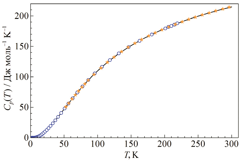В качестве сглаженной функции теплоемкости Cp[fit](T) в интервале 0–11 K принято описание уравнением (1), а в интервале 11–300 K выполнено описание в рамках суммы теплоемкостей Эйнштейна. При этом для получения Cp[fit](T) выше 11 K использовалась как полученная в настоящей работе экспериментальная теплоемкость (рис. 2, кружки), так и данные [2] (рис. 2, звездочки). Результат приведен в качестве сплошной кривой на рис. 2.