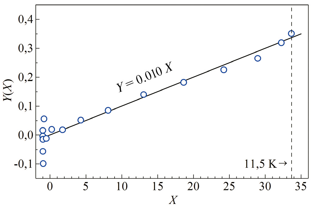 Рис. 3. Теплоемкость Na2W2O7 в линеаризованных координатах Y(X) (2) в интервале 0–11.5 K: кружки — экспериментальные значения; прямая линия — описание экспериментальных данных в рамках комбинации моделей Дебая и Эйнштейна.