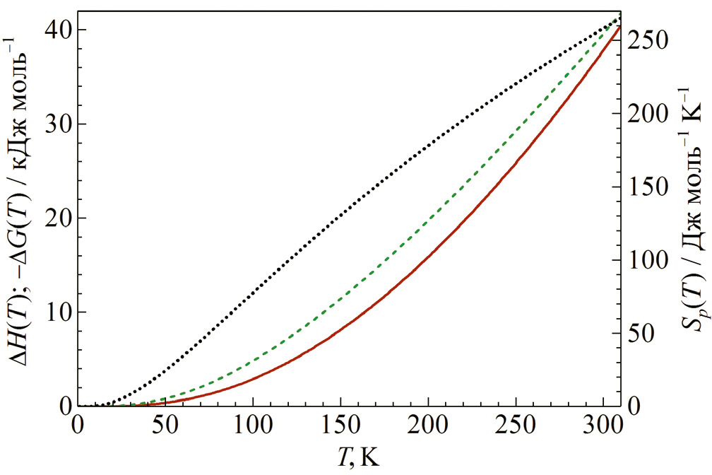 На основе сглаженной зависимости Cp[fit](T) в температурном диапазоне от 0 до 300 K вычислены термодинамические функции Na2W2O7: энтропия Sp(T), энтальпии ∆H(T) и свободная энергия Гиббса ΔG(T). Результаты вычисления термодинамических функций приведены на рис. 6. Значения этих термодинамических функций при стандартных условиях (T = 298.15 K, p = 0.10 МПа) составили:
