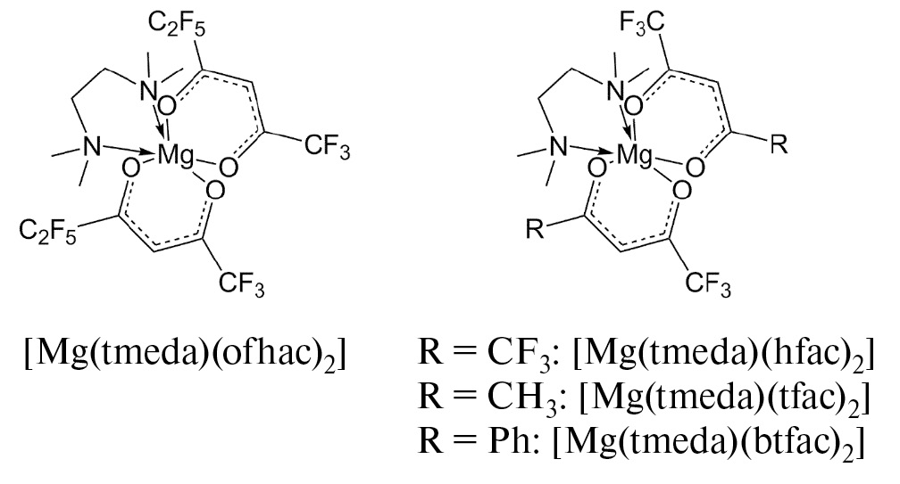 В настоящее время набор летучих фторированных соединений магния ограничен комплексами со фторированными β-дикетонат-ионами L = RFC(O)CHC(O)R-. Такие лиганды активно используются в связи с возможностью изменять термические свойства комплексов в широких пределах путем варьирования терминальных заместителей (R, RF). Однако гомо- и гетеролептические комплексы [Mg(L)2]n (n = 2–3, RF = СF3, C2F5, C3F7, R = СF3, CH3, C(CH3)3) [17–19] и [Mg(dmamp)(L)]2 (dmamp = 1-диметиламино-2-метил-2-пропаноат) [20] являются олигомерами, что уменьшает их летучесть и осложняет контроль состава газовой фазы в процессах осаждения.
