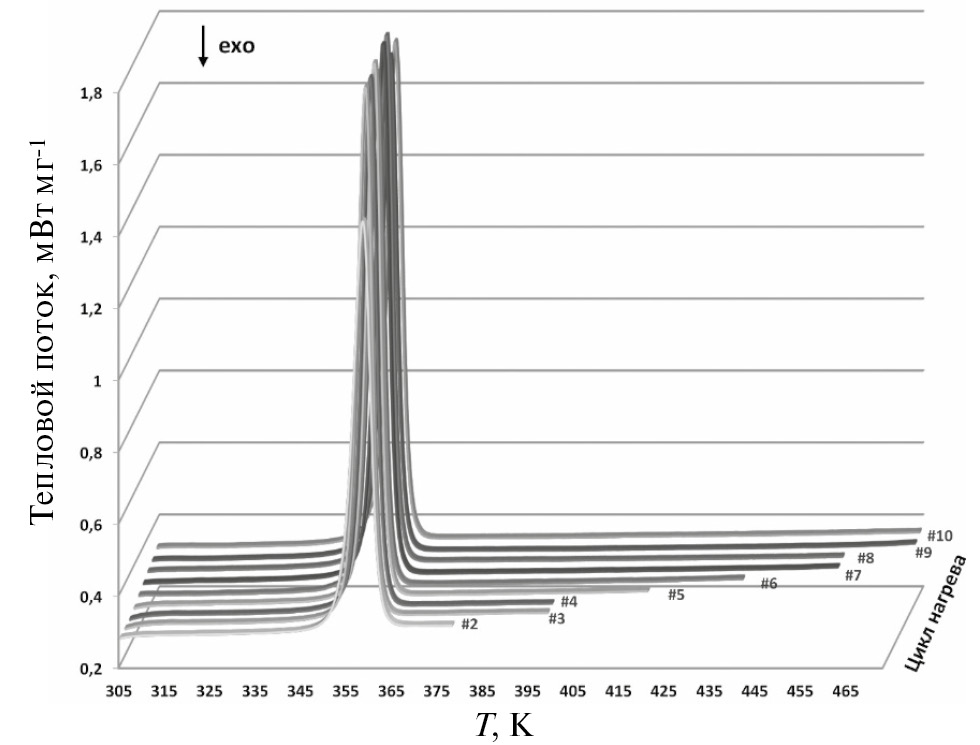 Исследование методом ДСК показало отсутствие фазовых превращений комплекса до плавления. Для проверки термической стабильности образцы подвергали многократным циклам «нагрев–охлаждение» до разных температур. Пример такого эксперимента приведен на рис. 2. Базовая линия и характеристики пика плавления воспроизводились в пределах точности метода во всем исследованном интервале (до 473 K, предел герметичности Al тигля). Статистическая обработка (95%-ный доверительный интервал) позволяет получить следующие данные: Тпл. = 354.4 ± 0.6 K, ∆плH°Тпл. = 23.3 ± 0.9 кДж/моль, ∆плSТпл. = 65.1 ± 2.5 Дж/(моль∙K).Температура плавления соответствует результатам ДТА исследования и визуальным наблюдениям [26]. Новый комплекс является более низкоплавким, чем аналог [Mg(tmeda)(tfac)2], в котором β-дикетонатный лиганд содержит CH3-группу вместо C2F5 (разница ~ 10 K) [24]. Отличия в энтальпии и энтропии плавления этих соединений не превышают 10%, а сами величины существенно меньше, чем у родственного комплекса с L = btfac, содержащего ароматическую Ph-группу, который является наиболее тугоплавким в ряду [Mg(tmeda)(L)2] [25].