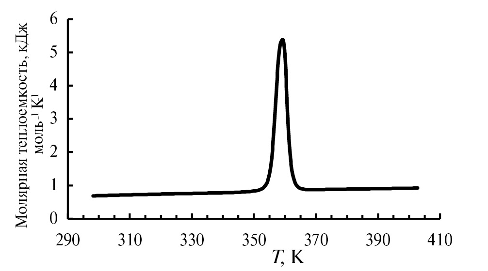 Калориметрические измерения проведены на дифференциальном сканирующем калориметре (ДСК) NETZSCH DSC 204 F1 Phoenix. ДСК измерения проводили при постоянной скорости нагрева 9 K мин-1, масса навесок – (9.50–11.50) ± 0.01 мг, тигли Al закрытого типа. Термическую стабильность образцов изучали методом теплового потока, теплоемкость измеряли методом ДСК, при этом использовали сравнительный метод, когда измерялась разница между сигналами тигля с веществом и пустым тиглем. Теплоемкость исследуемого вещества определяли на основе теплоемкости стандартного соединения, в качестве которого был выбран синтетический сапфир (Al2O3) массой m = 12.14 мг. Из экспериментальных результатов вычитали сигнал базовой линии, полученной при нагреве 2 пустых тиглей. Обработку экспериментальных данных, определение значений теплоемкости, температуры плавления Tonset и энтальпии Δпл.H переходов производили в программном пакете Netzsch Proteus Analysis. Калибровку датчика теплового потока и градуировку температурной шкалы осуществляли по пикам плавления и твердотельным переходам стандартных веществ (циклогексан, адамантан, Hg, KNO3, In, Sn, Zn), свидетельство о поверке №С-С/02-02-2022/129404261. Стандартные погрешности измерений температуры, удельной теплоты и теплоемкости составили 0.2 K, 2.5 и 1.5% соответственно.