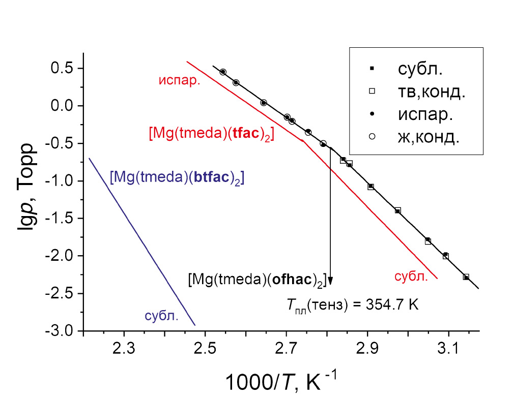 Методика синтеза [Mg(tmeda)(ofhac)2] основана на замещении диамином аквалигандов в комплексе [Mg(H2O)2(ofhac)2], который получается в результате нейтрализации основного карбоната магния β-дикетоном. Детали синтетических процедур описаны в нашей предыдущей работе [26]. Целевой продукт очищали двукратной вакуумной сублимацией (423 K/0.01 Торр).