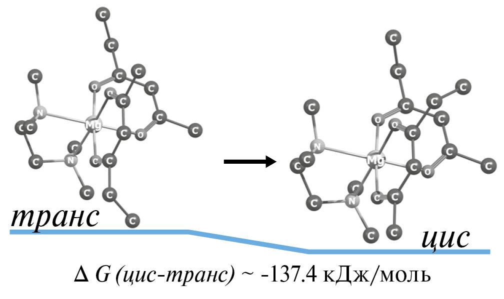 Следует отметить, что, вследствие асимметрии β-дикетонатного лиганда, [Mg(tmeda)(ofhac)2] может существовать в виде геометрических изомеров, отличающихся взаимным расположением терминальных групп (цис- или транс-, рис. 5). При этом, в отличие от других асимметричных комплексов (L = btfac, tfac [23, 44]), данные рентгеноструктурного анализа для данного соединения не позволяют однозначно определить изомер, присутствующий в кристаллической фазе вследствие сильного позиционного разупорядочения лигандов [26]. В этой связи нами проведено сравнительное квантово-химическое исследование этих возможных изомеров в газовой фазе.