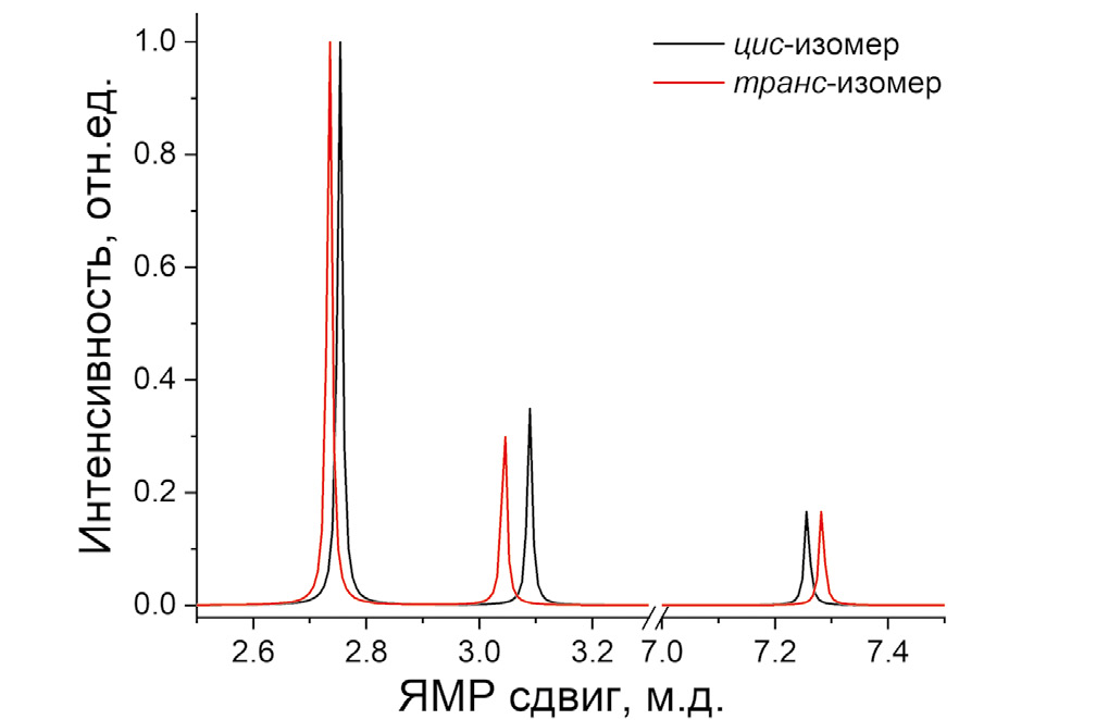 Рис. 6. Теоретические 1H ЯМР спектры цис- и транс-изомеров [Mg(tmeda)(ofhac)2].