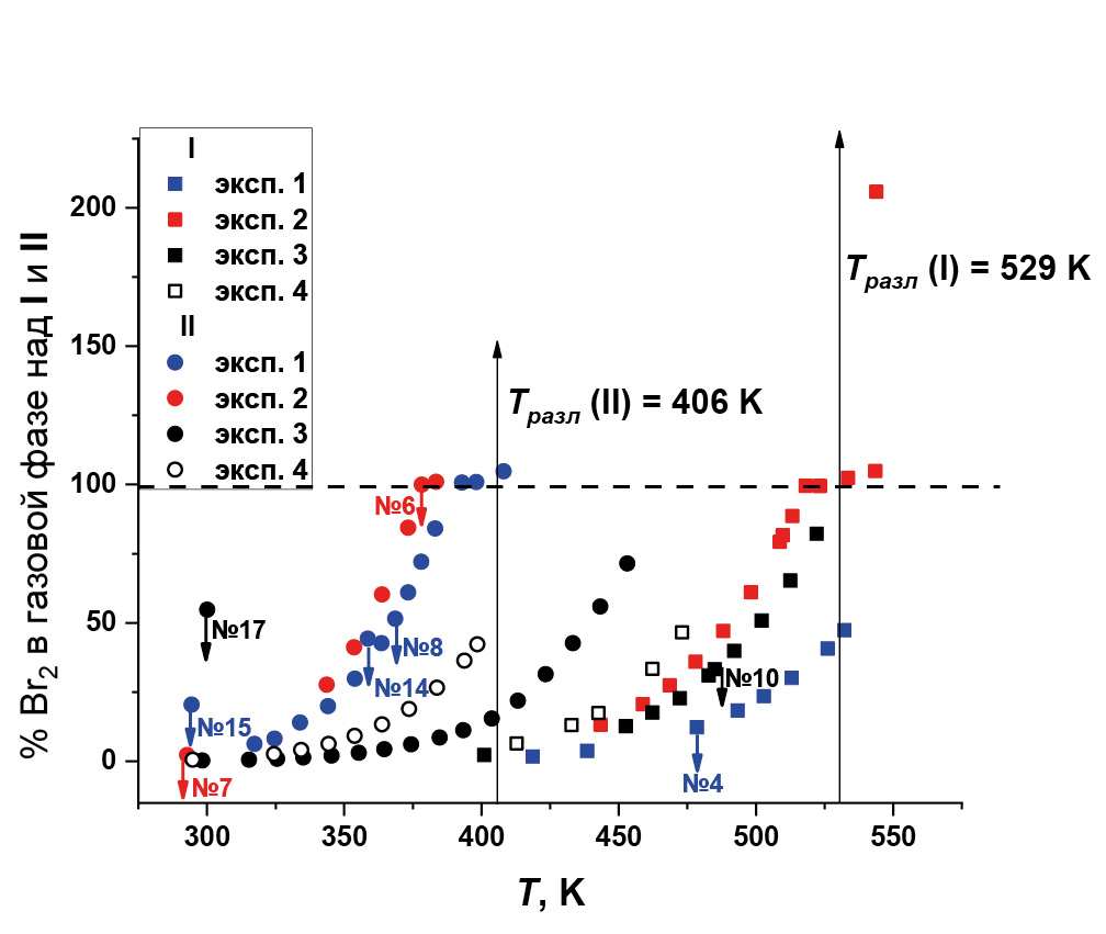 Необратимое разложение комплексов характеризуется отклонением от прямых насыщенного (комплекс II, эксп. 3) и ненасыщенного пара (комплекс I, эксп. 2 и комплекс II, эксп. 1), а также необратимым изменением давления (несовпадение значений давления при нагревании и охлаждении). Последняя точка эксп. 2 комплекса I, а для комплекса II точки № 14, 15 эксп. 1 и точка № 17 эксп. 3 заметно отклоняются от прямых насыщенного и ненасыщенного пара, поскольку в них уже присутствует давление продуктов разложения матрицы (cation)2[TeBr6]. Более наглядно температуры разложения комплексов показаны на рис. 3, где представлено количество брома, перешедшего в газовую фазу, рассчитанное в каждой экспериментальной точке (Ti,, pi,) j-го эксперимента, в процентах от исходного количества Br2 в навеске (mBr2):