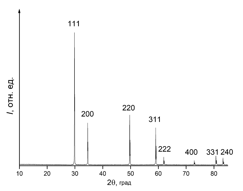 Рис. 1. Дифрактограмма образца твердого раствора Er2O3 ∙ 2HfO2, структурный тип Fm3m, а = 5.185(2) А, CuXa-излучение, X = 1.5418 А.