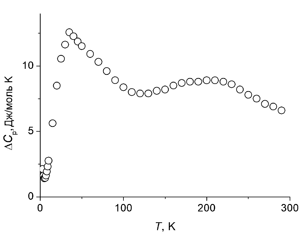 В отличие от магнитных явлений, приводящих к увеличению теплоемкости в узком температурном интервале, взаимодействие 4f электронной оболочки происходит в широком температурном интервале, что и вносит аномальный вклад в теплоемкость (аномалия Шоттки) [19]. Для того чтобы определить его величину, необходимо выделить решеточную теплоемкость. В первом приближении, считая, что теплоемкость твердого раствора Lu2O3 ∙ 2HfO2 незначительно отличается от решеточной теплоемкости Er2O3 ∙ 2HfO2, определили общий вид аномалии Шоттки (рис. 5). Как видно, наблюдается ярко выраженный максимум величиной ~ 15 Дж/(моль K) при температуре около 50 K и более пологий (~ 7 Дж/(моль K)) – при температуре ~ 210 K. Следует отметить, что общий вид кривой аномальной теплоемкости Er2O3 ∙ 2HfO2 согласуется с кривой теплоемкости Шоттки для полуторного оксида Er2O3 [20].