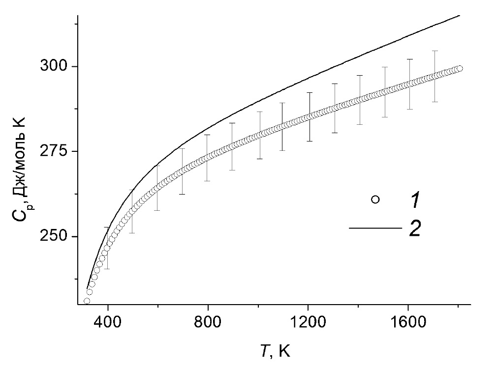 На рис. 6 приведены сравнение высокотемпературной теплоемкости твердого раствора Er2O3 ∙ 2HfO2 (1) и модельный расчет (2) из теплоемкостей простых оксидов Er2O3 [22] и HfO2 [23]. Как и для большинства гафнатов лантаноидов и твердых растворов, модельный расчет теплоемкости значительно отличается от экспериментальных значений, и ее использование в расчетах может привести к ошибочному результату, особенно при экстраполяции в область высоких температур.