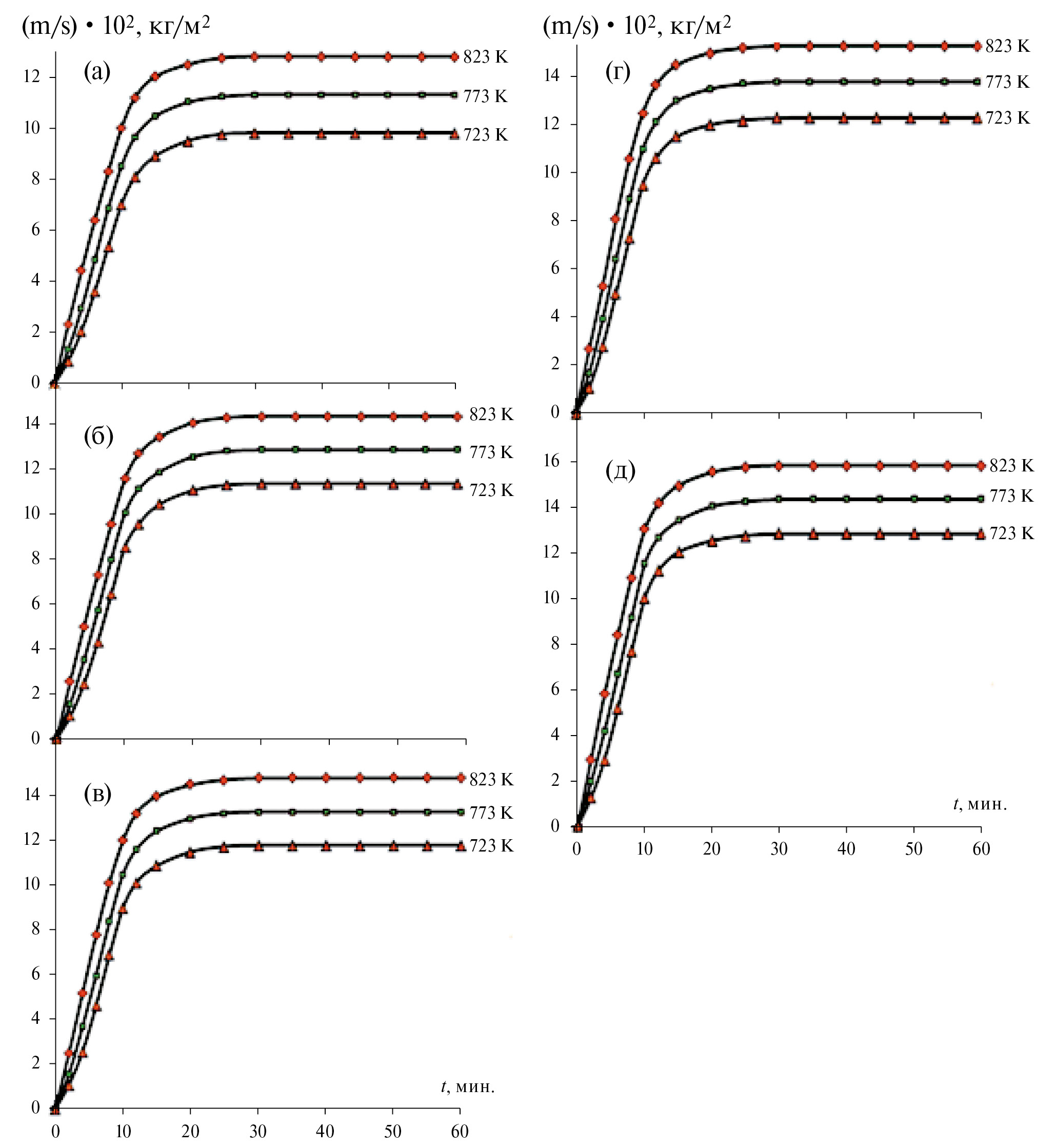Рис. 2. Кинетические кривые окисления алюминиевого проводникового сплава AlTi0.1 (а), содержащего кальций, мас. %: 0.01 (б); 0.05 (в); 0.1 (г) и 0.5 (д), в твердом состоянии.