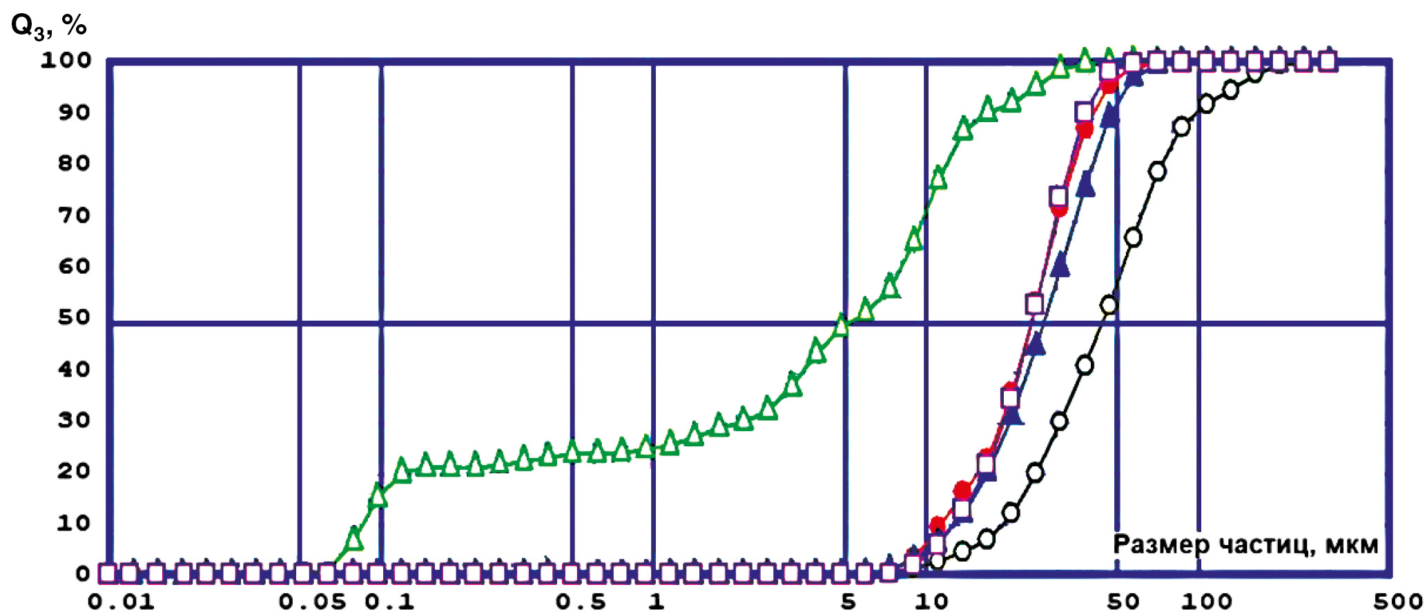 Рис. 1. Кривые интегрального распределения частиц серы по размерам после измельчения в центробежной мельнице: ○1 – исходная кривая; ●2 – после однократного измельчения; Δ3 – после двукратного измельчения; ▲4 – после трехкратного измельчения; □5 – после четырехкратного измельчения.