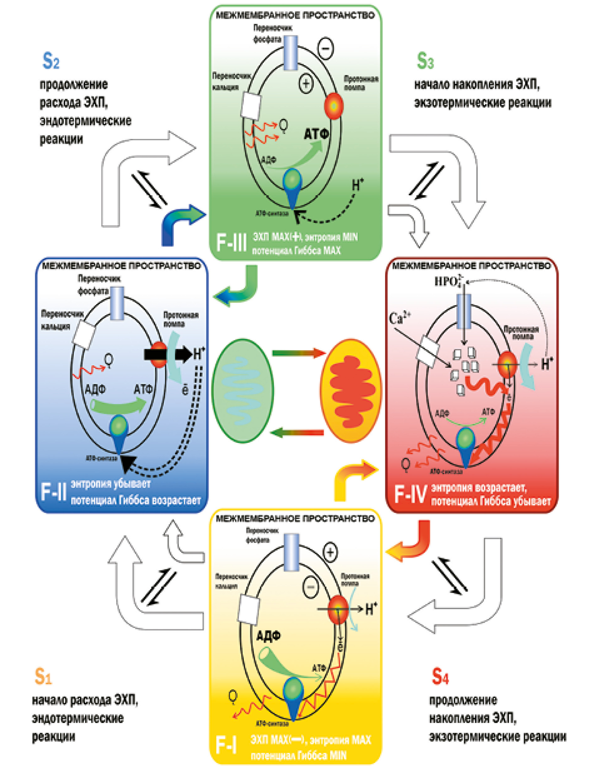Функциональные циклические процессы, протекающие в биогенезе М, позволяют понять механизм внутриклеточной трансформации солей СаР. Опираясь на характерные изменения электрохимических (ЭХ) параметров в матриксе и межмембранном пространстве М, а также исходя из термодинамических (ТД) преобразований, можно выделить четыре функциональных состояния М ( F-I, F-II, F-III, F-IV) и четыре переходных (S1,S2, S3, S4), которые представляют циклический процесс (рис. 1) [11]. Адекватное клеточное энергообеспечение молекулами АТФ предполагает прохождение М полного ТД-ЭХ-цикла, в котором чередуются физиологически допустимые переходы экзэргонических и эндэргонических процессов, сопровождающихся соответствующими изменениями свободной энергии Гиббса, энтропии, энтальпии, эксергии и плотности веществ (рис. 1).