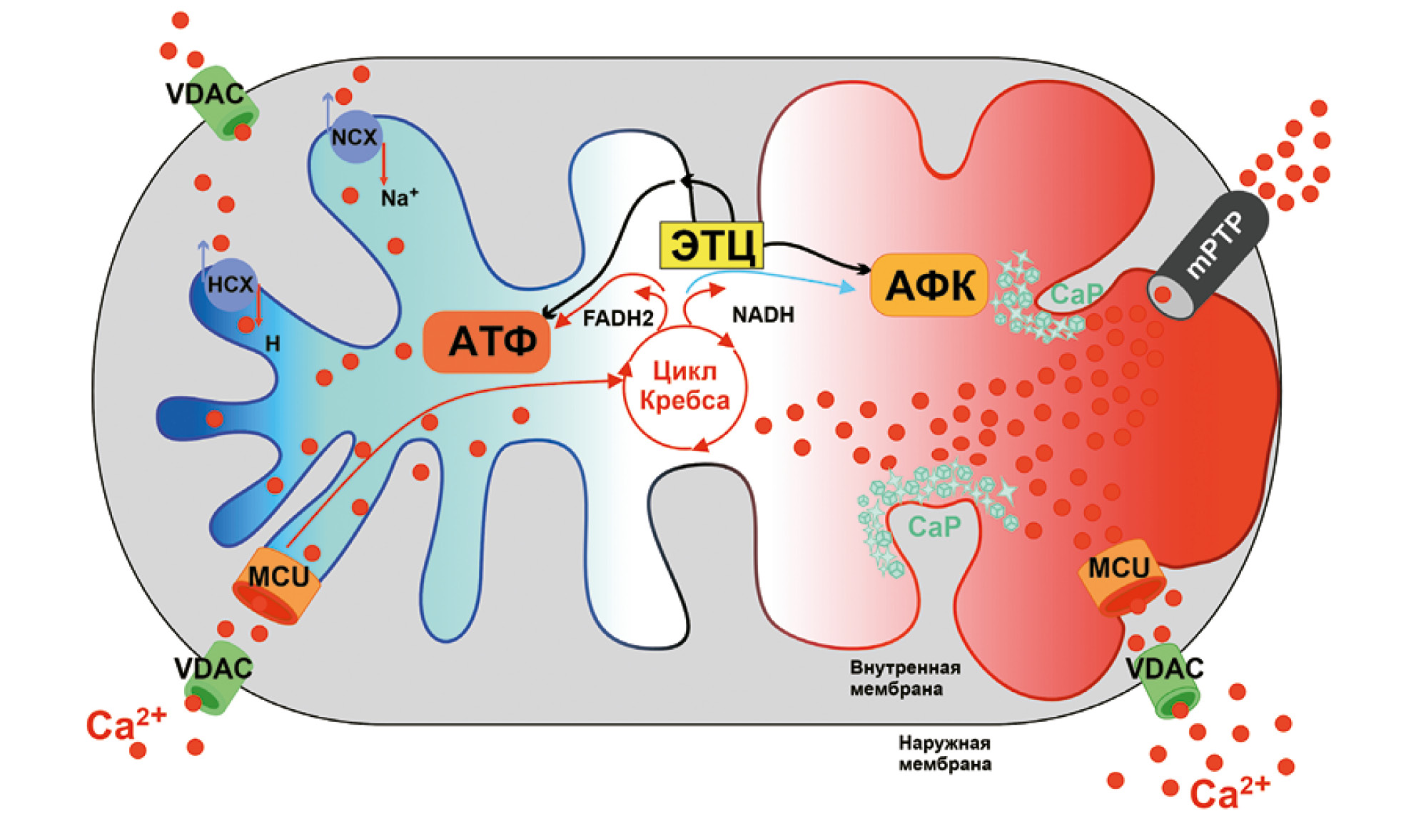 Существует много свидетельств того, что Са2+ обратимо секвестрируется в виде гранул СаР для поддержания энергетического гомеостаза. В М матриксе Ca2+ стимулирует цикл Кребса, тем самым усиливая синтез NADH и FADH2, что, в свою очередь, подпитывает электронную транспортную цепь (ЭТЦ) и, в конечном счете, прокручивает АТФ-синтазу [6, 7]. Более того, в М межмембранном пространстве Са2+ стимулирует активность различных переносчиков метаболитов, дополнительно усиливая энергетический метаболизм [8]. Поглощение Са2+ в энергизованных М препятствует подъему уровня Са2+ в цитоплазме, что приводит к быстрому затуханию кальциевого сигнала [9]. Способность М регулировать клеточную сигнализацию Ca2+ проявляется ускоренной аккумуляцией матриксом Ca2+, наряду с возможным замедлением выведения Ca2+ обратно в цитоплазму через Ca2+/Na+ и Ca2+/H+ антипортеры. Не вызывает сомнений, что указанные механизмы сбалансированного регулирования и управления внутриклеточного метаболизма Ca2+ являются определяющими в функциональной способности самой клетки.