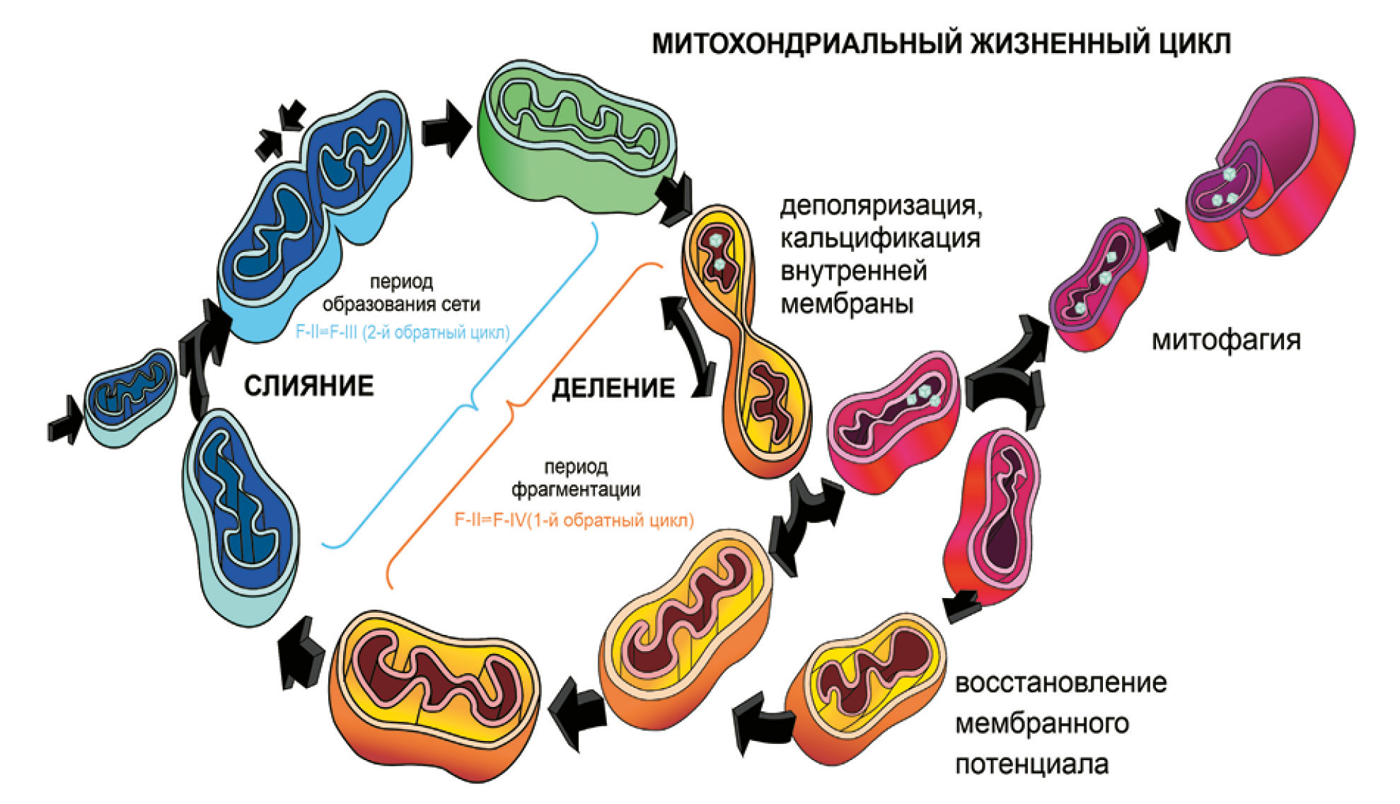 Рис. 3. Митохондриальный жизненный цикл (биогенез). Период слияния М с образованием «трубчатой сети» соответствует преобладанию второго обратного ТД-ЭХ-цикла (F-II ⇌ F-III). Период деления соответствует преобладанию первого обратного ТД-ЭХ-цикла (F-I ⇌ F-IV). Митофагии подвергаются фрагментированные, малоподвижные, деполяризованные, кальцинированные М.