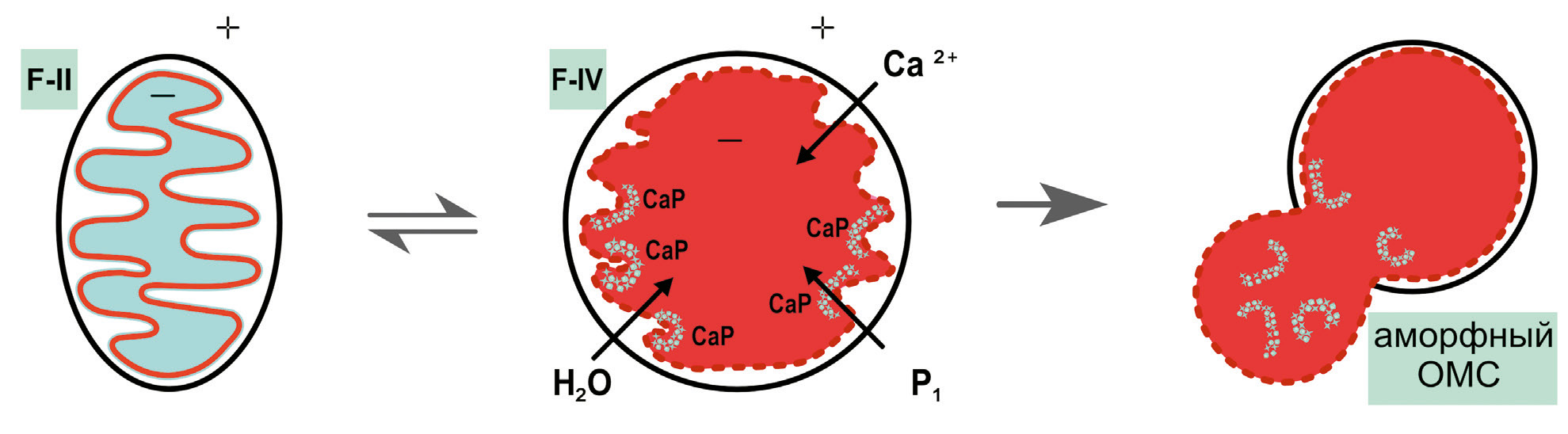 С точки зрения термохимии, в первом переходе обратного ТД-ЭХ-цикла (F-I ⇌ F-IV) образование СаР апатита сопровождается бурным выделением тепловой энергии, т.е. является экзотермическим процессом. Теплота кристаллизации апатита (СаР) относительно высока (+4121 кДж/моль) и наиболее выгодна с точки зрения ТД и ЭХ процесса. Однако второй переход обратного ТД-ЭХ-цикла, наоборот, сопровождается поглощением тепловой энергии из окружающей среды (цитоплазмы), т.е. является эндотермическим процессом. Нарушение метаболической гибкости во фрагментированных М характеризуется преобладанием первого обратного ТД-ЭХ-цикла (F-I ⇌ F-IV), которое способствует переполнению матрикса аморфным СаР. При этом повышается онкотическое давление и происходит разбухание матрикса с потерей секционного разделения крист (преобразуются «мегамитохондрии»), сопровождающееся полной потерей кинематического перемещения М в цитоплазме. При замедлении (угнетении) митофагии происходит критическое повышение осмотического давления в матриксе, который увеличивается в объеме (разбухание, отек), при этом возможно повреждение (разрыв) мембраны, при котором содержимое М вываливается в цитоплазму, окончательно повреждая клетку (рис. 4).