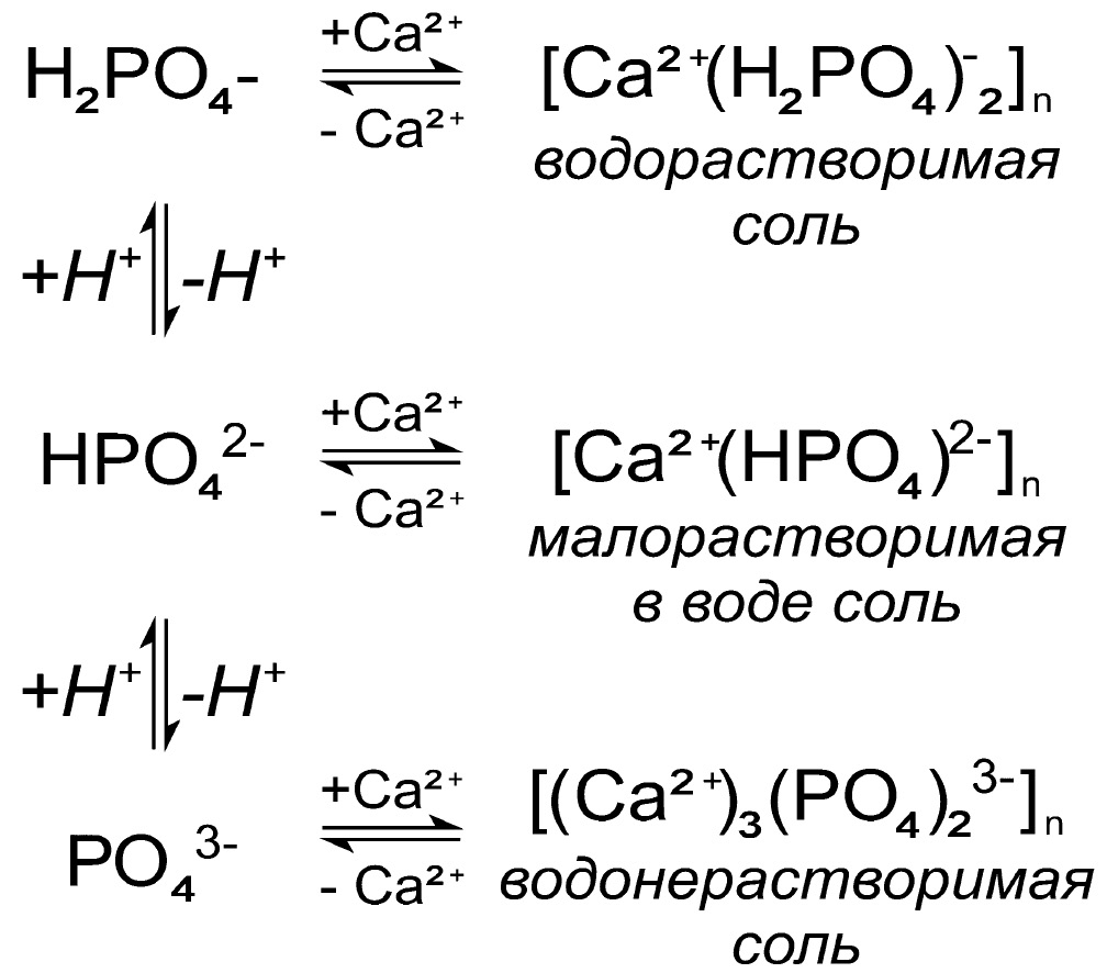 Основную роль в качестве внутриклеточного буферного механизма играют две верхние реакции. Кроме того, можно построить термодинамически допустимый ряд четырех последовательных химических реакций между кальциевым противоионом с фосфатным полиионом: