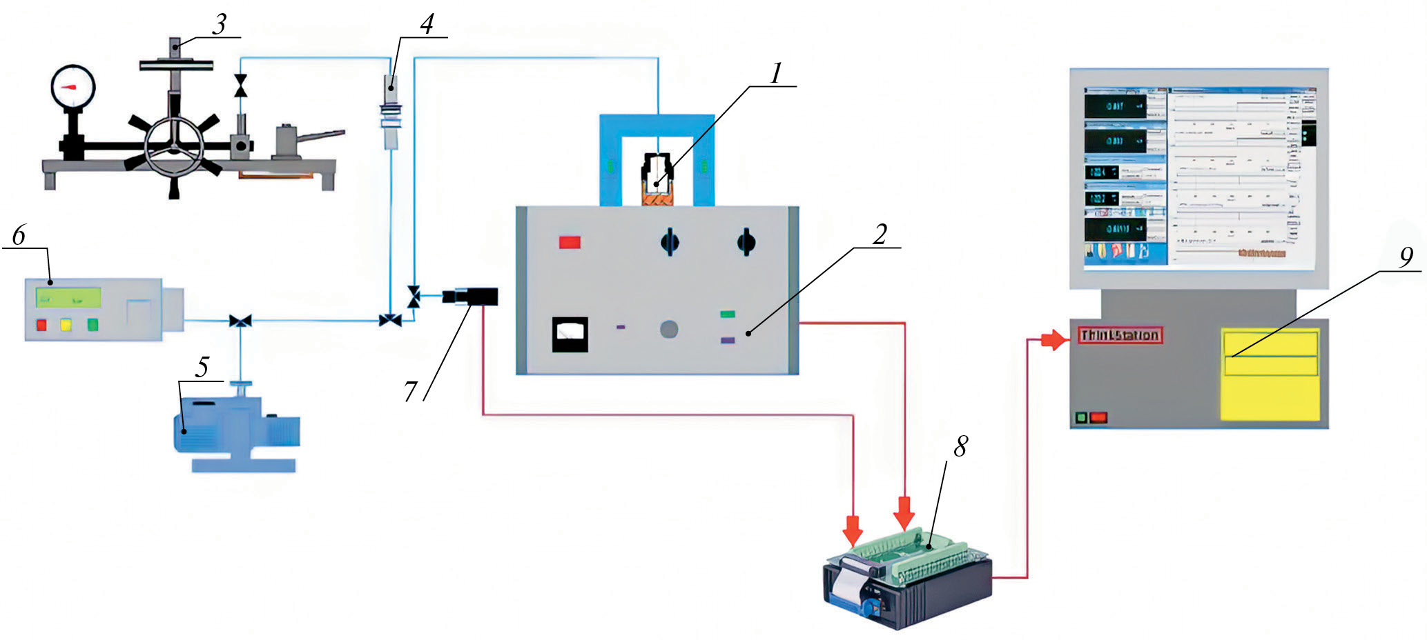 Рис. 1. Схема экспериментальной установки по измерению изобарной теплоемкости: 1 – измерительная ячейка, 2 – измерительный комплекс ИТ-с-400, 3 – грузопоршневой манометр, 4 – разделительный сильфонный узел, 5 – вакуумный насос, 6 – жидкостной насос, 7 – тензометрический датчик давления, 8 – аналогово-цифровой преобразователь, 9 – персональный компьютер.