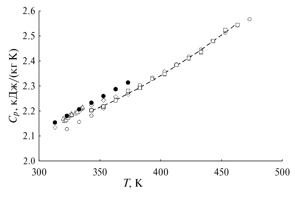 Рис. 2. Теплоемкость при атмосферном давлении фенола: пунктир - расчет по уравнению (2), □- настоящая работа, ∆ - Andon [6], ○ - Гурвич [21], ◊ - Zabransky [22], ● - Ruzicka [23].