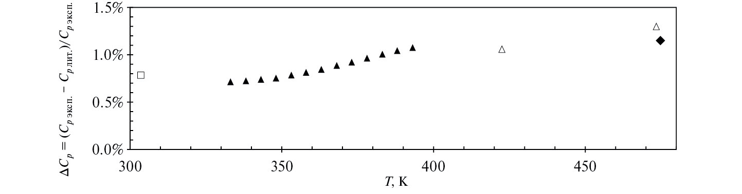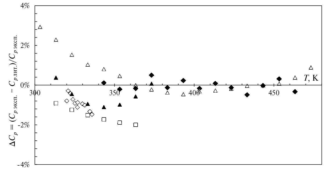 В табл. 3 представлены различные отклонения значений теплоемкостей, полученных в настоящей работе, от величин, найденных в работах авторов.
