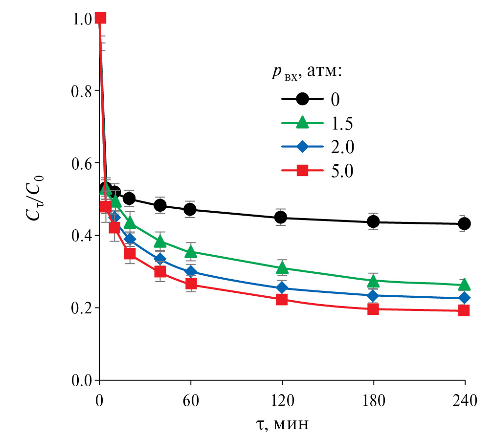 Рис. 6. Влияние входного давления на деструкцию цефтриаксона в гибридной системе ГАК/ПС/Fe2+: [ЦЕФ] = 36 мкM, [ПС] = 360 мкM, [Fe2+] = 100 мкM.