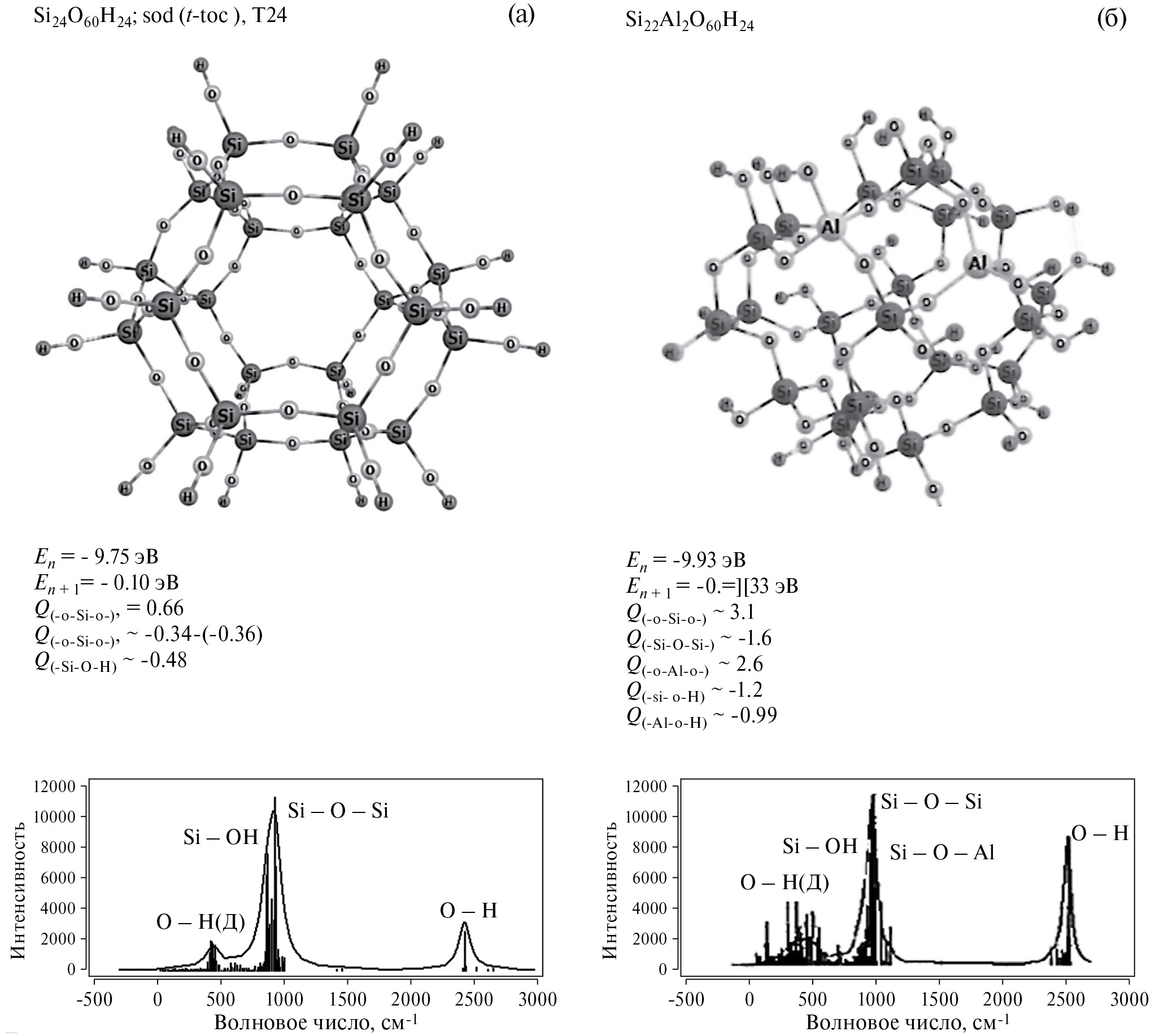 Электронные структуры содалитовой ячейки Т24 алюмосиликатов Si24O60H24 и Si22Al2O60H24 расчитаны полуэмпирическим методом РМ6 (рис. 1). Из результатов расчета видно, что наличие двух атомов алюминия в структуре Si22Al2O60H24 существенно влияет на энергию верхней занятой En- и нижней вакантной En+1 -орбиталей, на величину малликеновского заряда на атомах кремния Q(-o-Si-o-), мостиковых атомах кислорода Q(-Si-O-Si-) и атомах кислорода гидроксильных групп Q(-Si-O-H). При этом в их ИК-спектрах в положениях частот колебаний различной природы наблюдаются соответствующие изменения (рис. 1, а и б). Естественно, что при таком разнообразии в природе поверхностных атомов алюмосиликатных катализаторов реакции превращения алканов в их присутствии могут идти по разным механизмам, включающим радикальный, анион-радикальный, катион-радикальный, карбокатионный и карбоанионный.