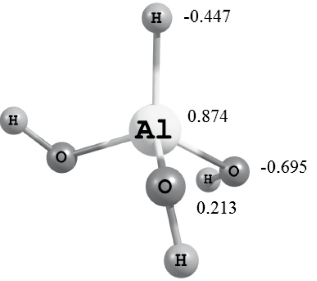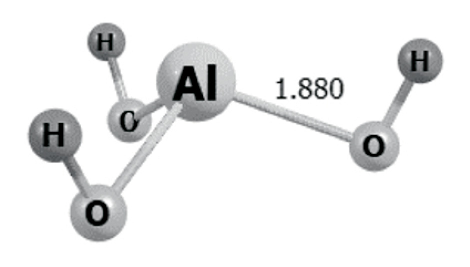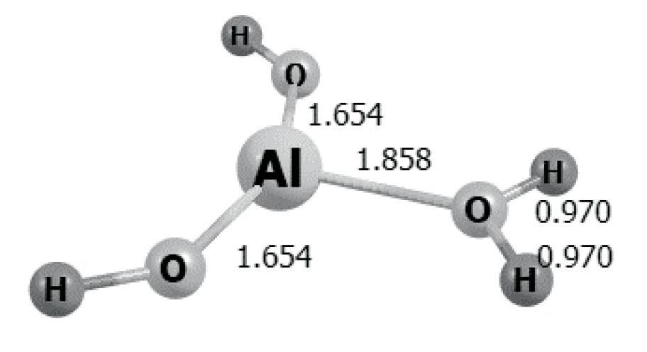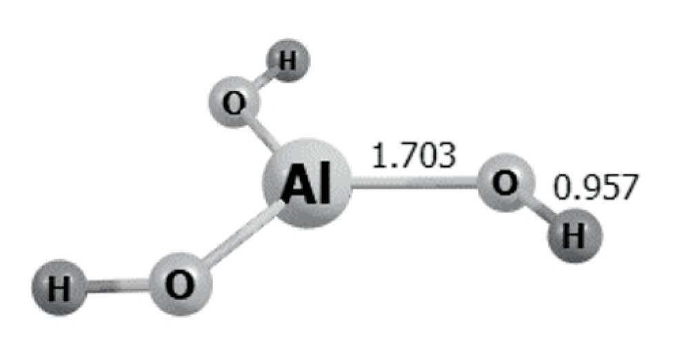 Структуры молекул Al(OH)3 и оптимизированы по методу DFT b3lyp/6-311g(d,p) (табл. 3). В молекуле Al(OH)3 атом Al является кислотным центром типа Льюиса, а в молекуле – основным центром. В молекуле связи Al–O длиннее, чем в Al(OH)3. Представляют интерес реакции присоединения к Al(OH)3 гидрид-иона водорода и протона. Оптимизированные структуры показывают, что в первом случае гидрид-ион атакует атом Al, образуя тетраэдрическую структуру, а во втором протон присоединяется к атому кислорода и образуется плоская структура, которая на -135.7 ккал/моль устойчивее. Отсюда следует вывод, что реакция присоединения гидрид-иона водорода к молекуле Al(OH)3 на DЕ0 = -196.6 ккал/моль выгоднее, чем присоединение протона.