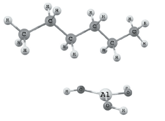 E0 = -707.097194 а.е. q = 0, M = 1 E0(н-С6Н14) = -236.965149 а.е. E0 [Al(OH)3] = -470.127029 а.е. ∆E(адсорбции)= -3.1 ккал/моль | (C6H13)= 0.1435; 0.8565 E0 = -707.090525 а.е. q = -1, M = 2 ∆Е0 = 4.2 ккал/моль |
