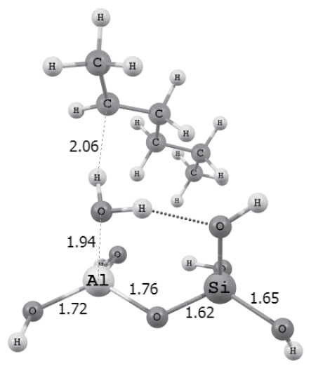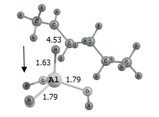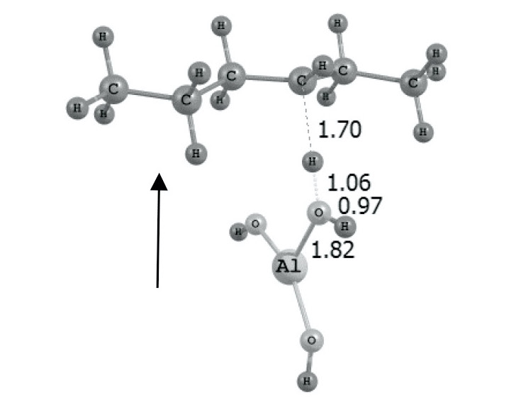 Таким образом, в случае, когда атом Al находится в тригональном гибридном состоянии sp2, он является сильным льюисовским кислотным центром и способен оторвать от изомера н-гексана гидрид-ион водорода, который, присоединяясь к атому алюминия, меняет его гибридное состояние на sp3.