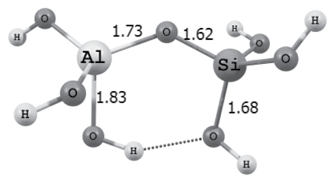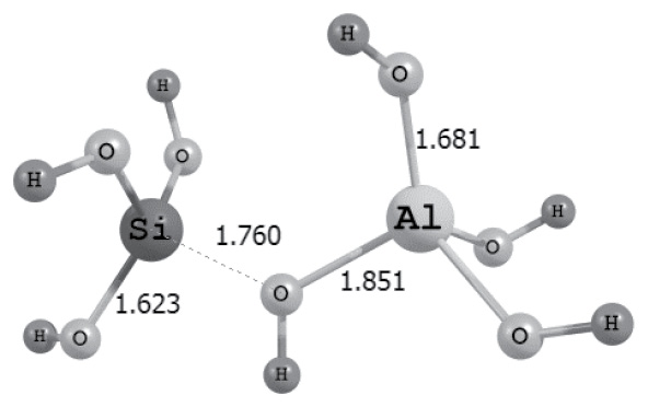 Сравнение малликеновских зарядов на атомах Si и Al в молекулах Si(OH)4 и показывает, что заряд qSi = +1.056 больше, чем qAl = +0.797 (табл. 2). Судя по значениям зарядов, атом кремния больше подвержен нуклеофильной атаке, чем атом алюминия. Кислородный атом в случае радикала Alзаряжен более отрицательно (-0.721), чем в Si(OH)4 (-0.597). Отметим, что в молекуле Al(OH)3 (плоская структура) атом Al имеет sp2, а после принятия электронной пары на свободную 3Р-орбиталь атома Al меняет гибридизацию на sp3 и молекула принимает тетраэдрическую структуру: