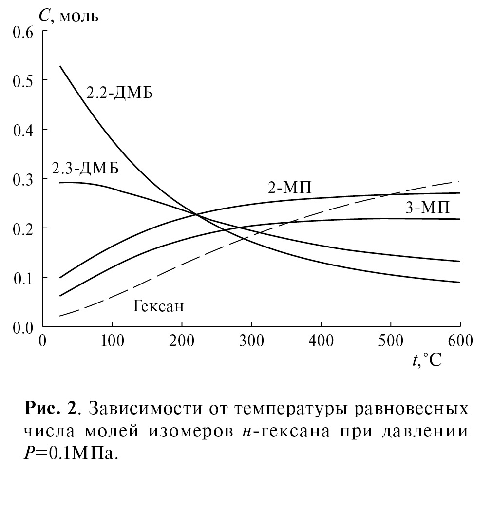 Результаты температурной зависимости равновесного состава 1 моля н-гексана при давлении 0.1 МПа при температуре ниже 200 °С показывают, что равновесные концентрации изомеров закономерно разнятся, а в области 300 °С они отличаются незначительно (рис. 2) [10]. Можно предположить, что в этой температурной области селективное превращение изомеров из-за термодинамических ограничений практически не осуществимо.