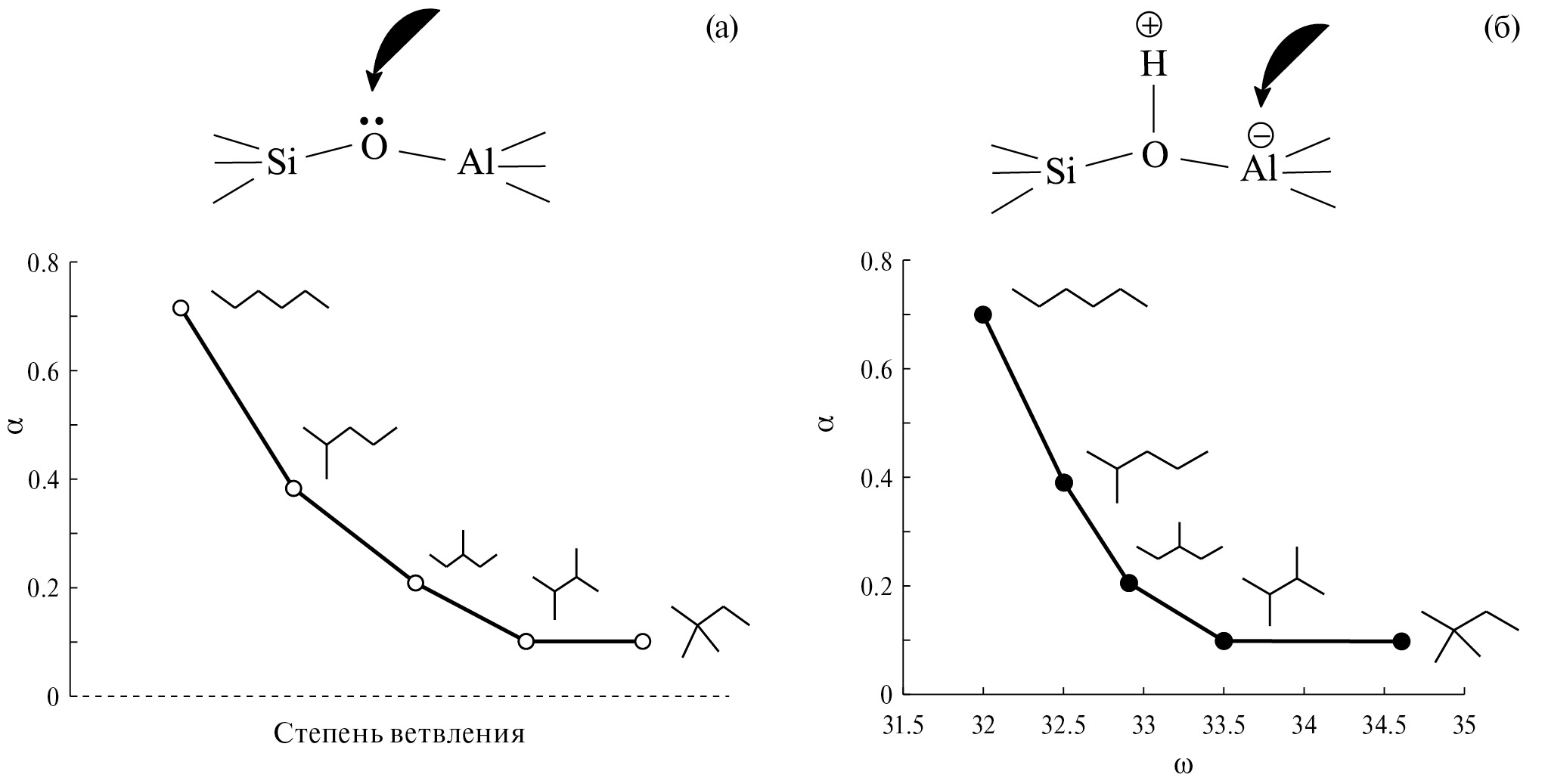 Как видно, эти две зависимости почти идентичны. Предполагая, что изомеры с большим индексом электрофильности ω будут атаковать активные центры катализатора с отрицательным зарядом – атомы кислорода, можно предложить следующие схемы по месту атаки на катализаторах ZSM-5 (схема а) и H-ZSM-5 (схема б):