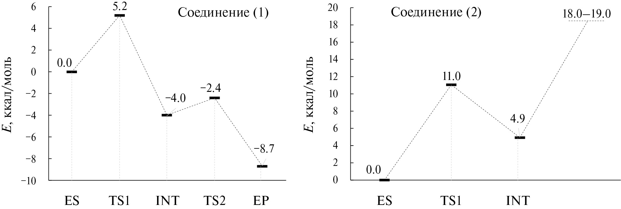Рис. 4. Сечения поверхности потенциальной энергии для реакции гидролиза: а – дибутил-4-нитрофенилфосфата (1) и б – дибутилфенилфосфата (2) в активном центре фосфотриэстеразы Pd-PTE. ES – фермент-субстратный комплекс, TS1 и TS2 – переходные состояния, INT – интермедиат, EP – комплекс фермент-продукт