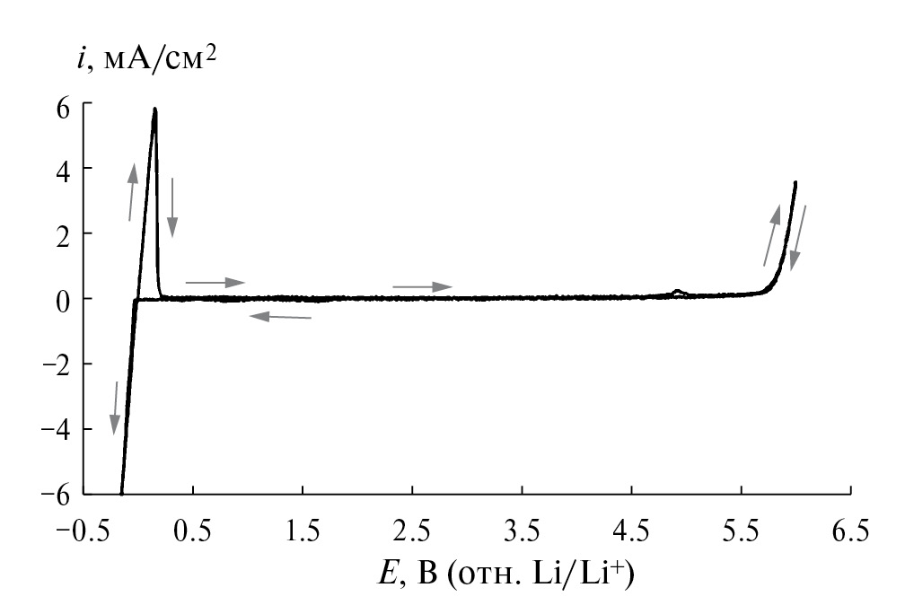 Сульфолановые растворы LiN(SO2CF3)2 обладают широким окном электрохимической устойчивости. Так, по данным циклической вольтамперометрии, анодная устойчивость 1 М раствора LiN(CF3SO2)2 в сульфолане на платиновом электроде составила 5.75 В относительно литиевого электрода сравнения (рис. 4).