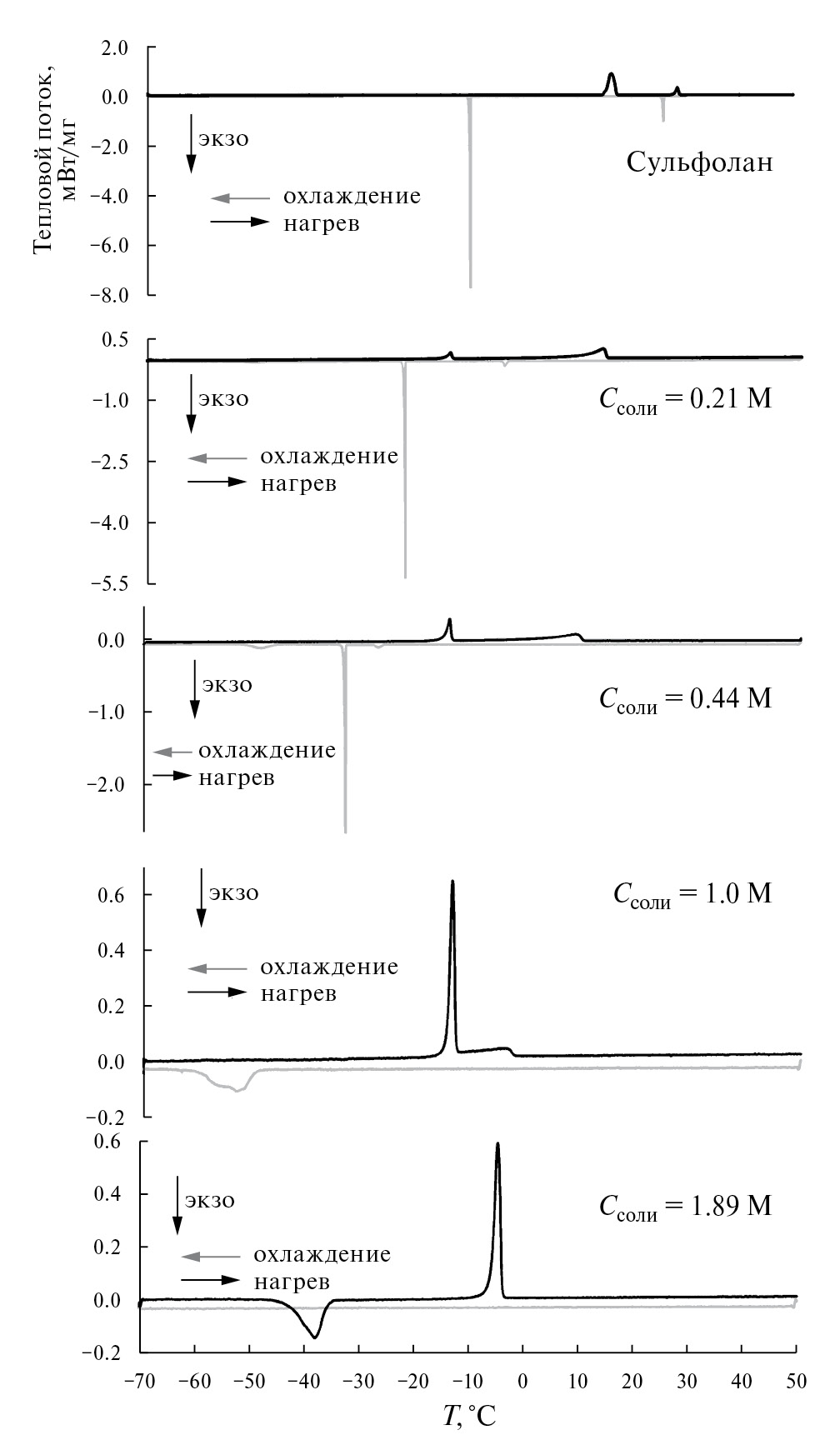 На термограммах ДСК разбавленных сульфолановых растворов LiTFSI также наблюдается по два пика, соответствующих плавлению кристаллической и мезоморфной фаз сульфолана (рис. 6 и табл. 2S в Дополнительной информации). По мере увеличения концентрации соли температуры плавления кристаллической и мезоморфоной фаз уменьшаются. Растворы LiTFSI в сульфолане также сохраняют склонность к образованию переохлажденных состояний. Интересные свойства проявляет высококонцентрированный (1.89 М) раствор LiTFSI. На кривых охлаждения этого раствора никаких тепловых эффектов не наблюдается (рис. 6). Однако на кривых нагрева первоначально, при температуре –45.5 °С, проявляется экзотермический эффект, а затем при температуре –6.3 °С – эндотермический. Из полученных экспериментальных данных следует, что с ростом концентрации сульфолановых растворов LiTFSI увеличивается их склонность к образованию переохлажденных состояний.