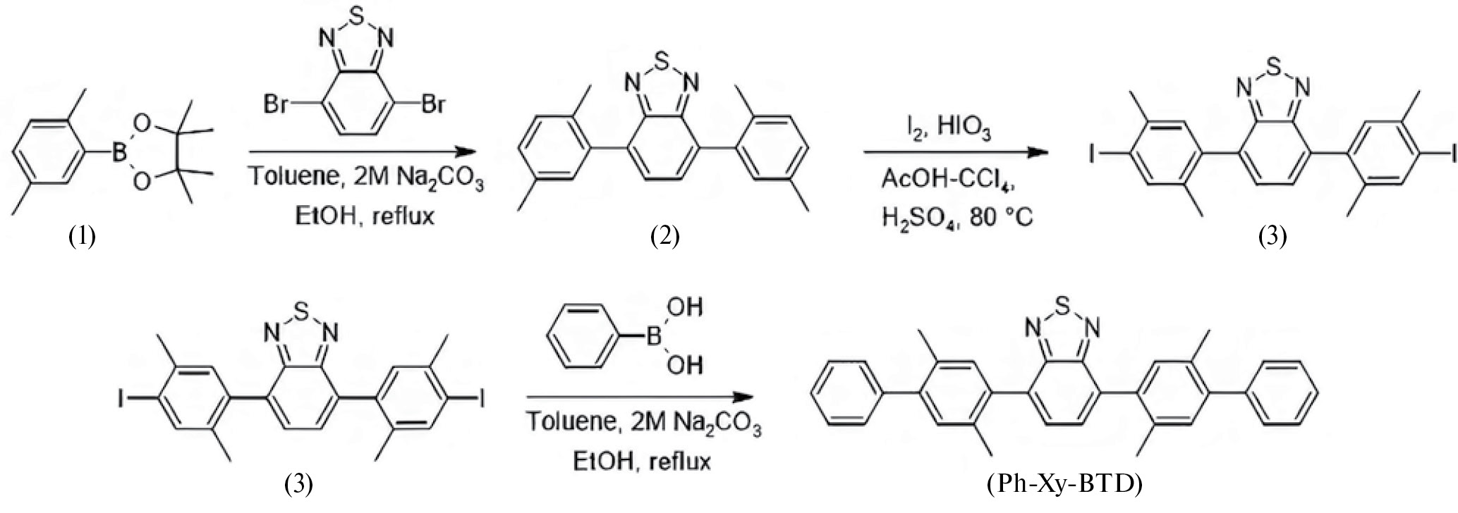 Синтез Ph-Ph-BTD проводили по методикам, описанным ранее [1]. Получение нового фенилксилольного производного бензотиадиазола Ph-Xy-BTD осуществляли комбинацией реакций кросс-сочетания Сузуки – Мияура и галогенирования (рис. 2). В целом следует отметить, что получение соединения 2 по реакции кросс-сочетания, видимо, осложнено стерически. В пользу этого говорят большое время проведения реакции (4 суток) и неполная конверсия исходных прекурсоров. Галогенирование ксилольного производного 2 за счет электроноакцепторного влияния бензотиадиазола затруднено. При бромировании молекулярным бромом не наблюдается селективного галогенирования, и, по данным ЯМР, смесь содержит в равных количествах оба изомера. Использование комбинации йод – йодноватая кислота позволяет селективно вводить галоген в параположение ксилола. На последней стадии после реакции Сузуки – Мияура и очистки методом колоночной хроматографии на силикагеле было получено чистое целевое соединение Ph-Xy-BTD.