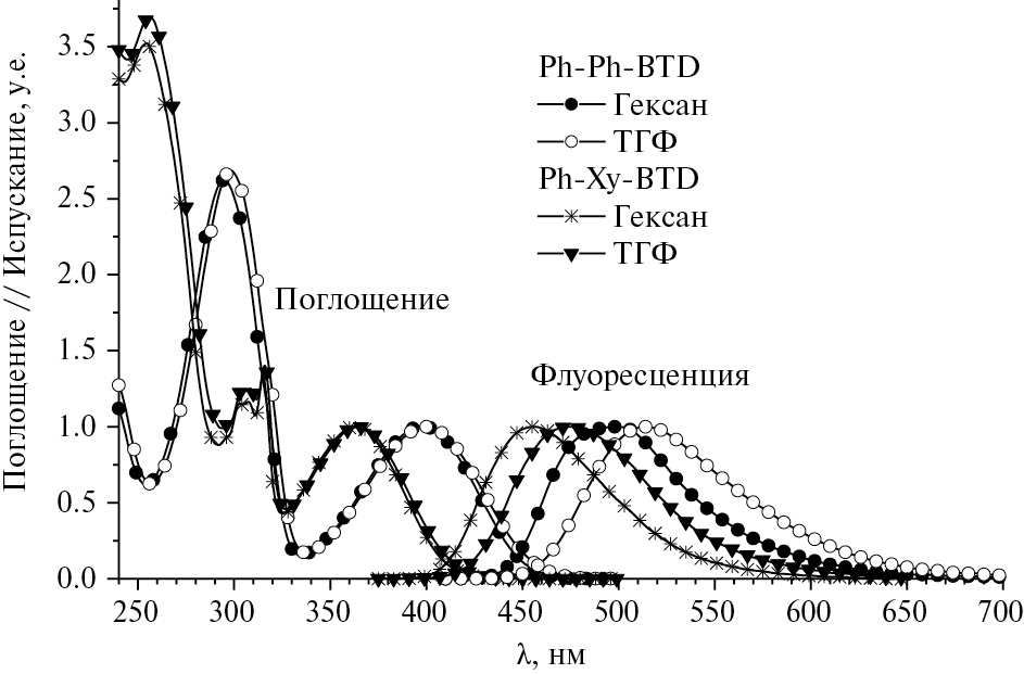 На рис. 5 представлены нормированные спектры поглощения и флуоресценции растворов Ph-Ph-BTD и Ph-Xy-BTD в н-гексане и в ТГФ. Значения квантового выхода QYF и времени жизни флуоресценции tF приведены в табл. 2.