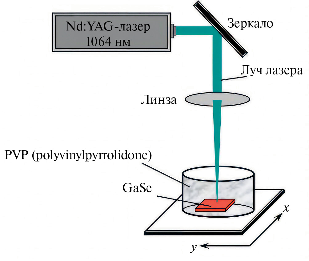 Схема экспериментальной установки представлена на рис. 1. Лазерное излучение с длиной волны 1064 нм, сфокусированное положительной линзой (f = 11 см), использовали для абляции кристалла GaSe диаметром 1.5 см. Лазерная абляция кристалла GaSe проводилась в кварцевой кювете, содержащей 5 мл растворе PVP (polyvinylpyrrolidone) в этаноле, без добавления каких-либо поверхностно-активных веществ. Процесс абляции проводили при нормальном давлении с энергией лазера 135 мДж в импульсе с частотой 7 Гц и времени абляции 10 мин.