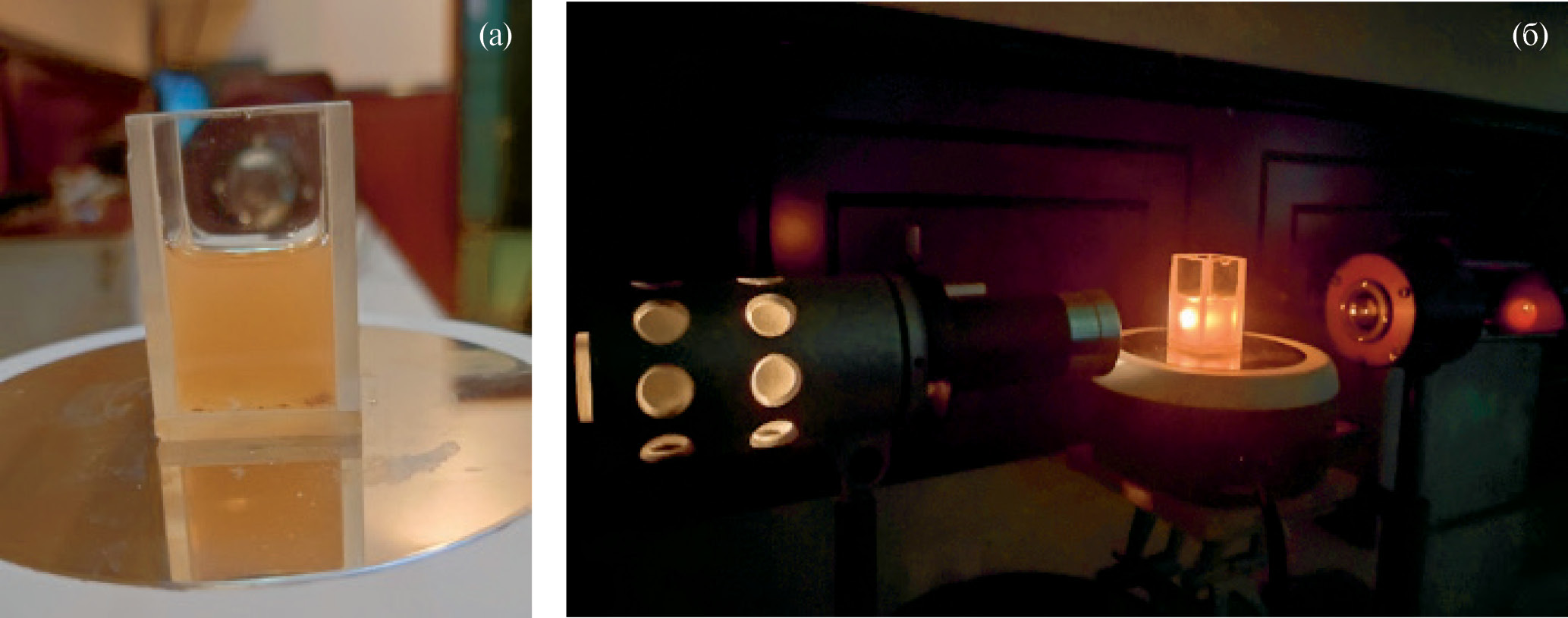 Рис. 2. Коллоидный раствор, полученный методом лазерной абляции GaSe в жидкой среде: а – при интенсивности лазерного излучения 1024 квант/(см2 с); б – при 1027 квант/(см2с).