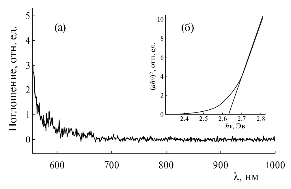 Кривая поглощения из коллоидного раствора наночастиц GaSe представлена на рис. 4а. Начало поглощения при ~ 550 нм согласуется с поглощением ансамбля наночастиц, максимальный диаметр которых составляет ~ 20 нм. Учитывая, что GaSe является полупроводником с прямой запрещенной зоной, из зависимости α2~ƒ(hʋ) была определена ширина запрещенной зоны исследованных образцов, которая оказалась равной Eg=2.64 эВ (рис. 4в). Эта величина на 0.53 эВ больше ширины запрещенной зоны объемного материала (Eg = 2.11 эВ, [10]). Следует отметить, что сдвиг максимума излучения наночастиц в коротковолновую область спектра по сравнению с объемным кристаллом является характерной особенностью полупроводниковых наночастиц, которая связана с увеличением ширины их запрещенной зоны.