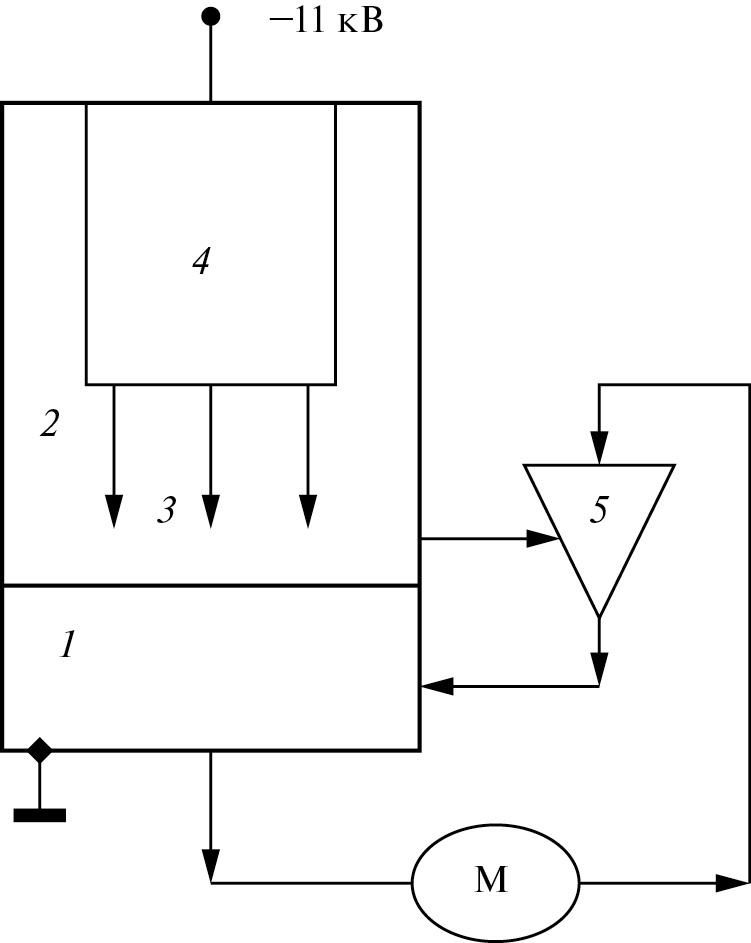 Рис. 1. Схема эксперимента. Цифрами обозначены: 1 – обрабатываемая жидкость, 2 – реакционный сосуд, 3 – разрядные электроды, 4 – RC-матрица, 5 – эжектор, М – водяной насос.