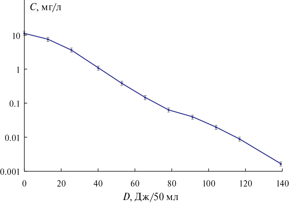 Зависимость концентрации тетрациклина в водном растворе от дозы обработки озоно-гидроксильной смесью представлена на рис. 2. Обработка раствора осуществлялась в реакторе объемом жидкости 80 л при циркуляции жидкости со скоростью 480 л/ч. Из рисунка видно, что концентрация тетрациклина экспоненциально уменьшается и при дозе ~140 Дж/50 мл достигает значения (1.7 ± 0.3) 10–3 мг/л. Доза 140 Дж/50мл достигается за время циркуляции в течение 60 мин, что соответствует шестикратному обмену жидкости в сосуде 2. Экспоненциальная зависимость означает, что деградация тетрациклина может быть описана реакцией второго порядка. Концентрация тетрациклина (1–2) 10–3 мг/л наблюдается в природных источниках, и об их очистке речи не идет [5]. Поэтому степень очистки воды, достижимая при обработке коронным электрическим разрядом, может быть приемлемой. Повышенная концентрация антибиотиков может наблюдаться в водопроводной воде городов. Такая вода нуждается в усиленной очистке. Полученный в работе результат означает, что водопроводная вода может быть подвергнута глубокой очистке от тетрациклина путем обработки озоно-гидроксильной смесью, генерируемой коронным электрическим разрядом. Скорость реакции с уменьшением концентрации тетрациклина уменьшается, но расход энергии на очистку воды остается в разумных пределах. Предпочтительным способом обработки является циркуляционная обработка в течение времени, зависящего от степени загрязнения воды, с использованием накопительной емкости.